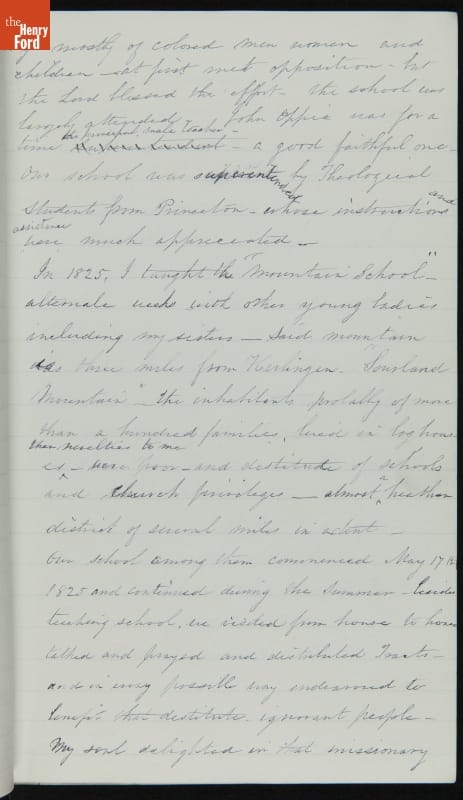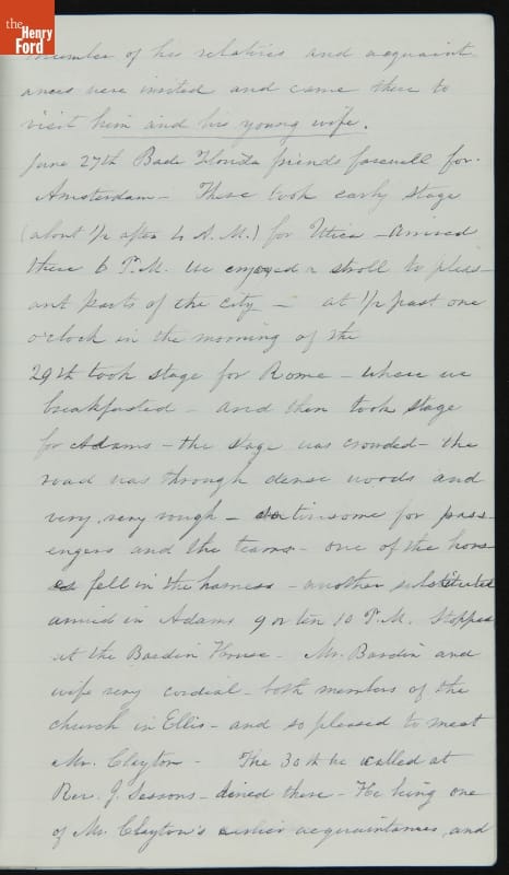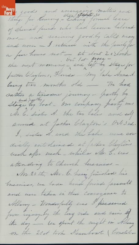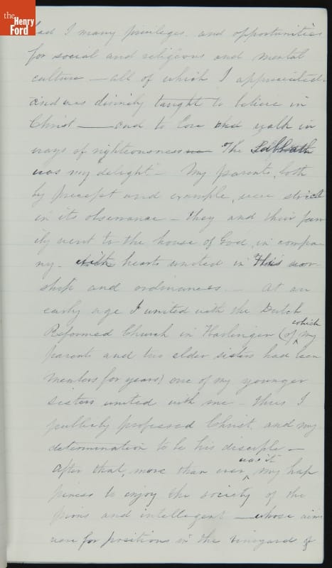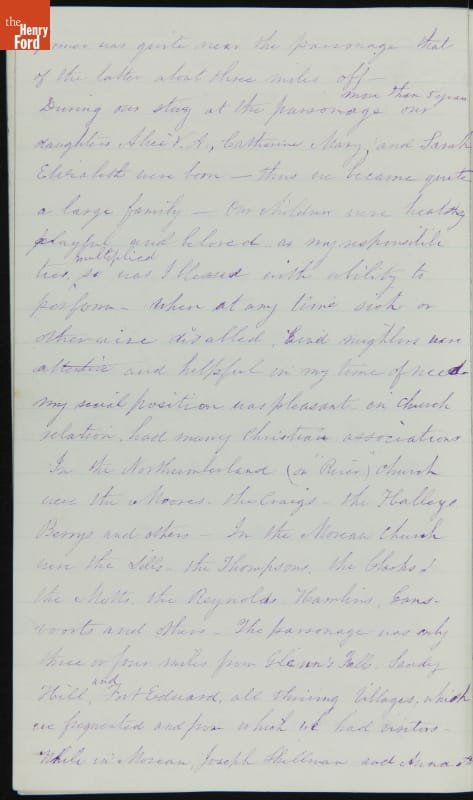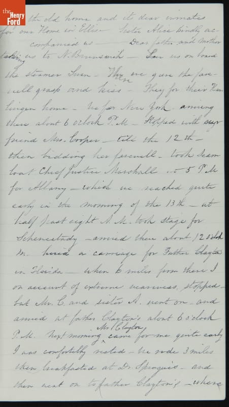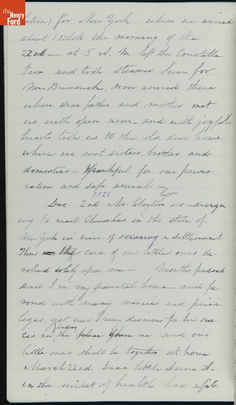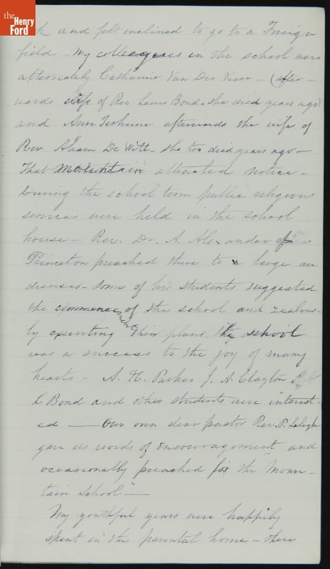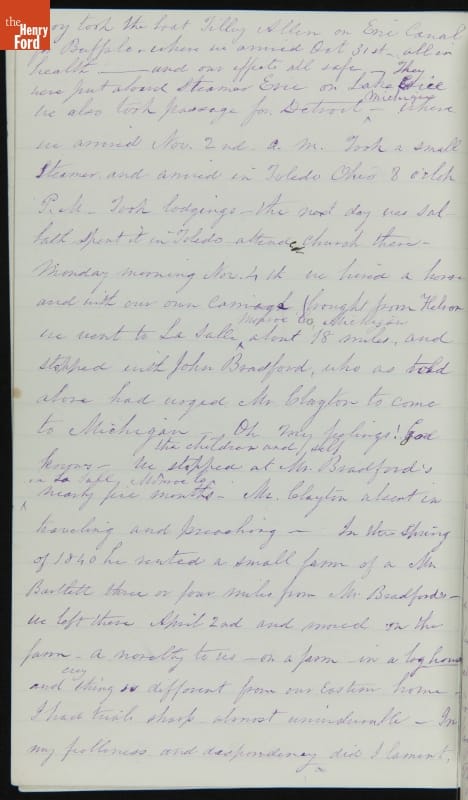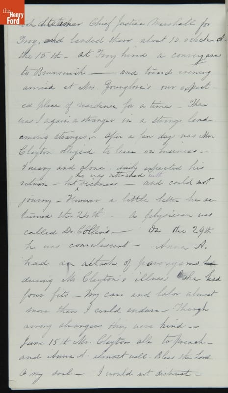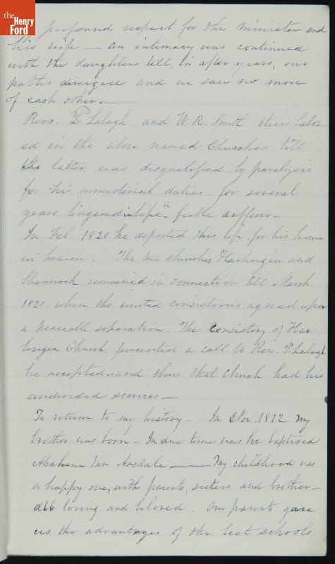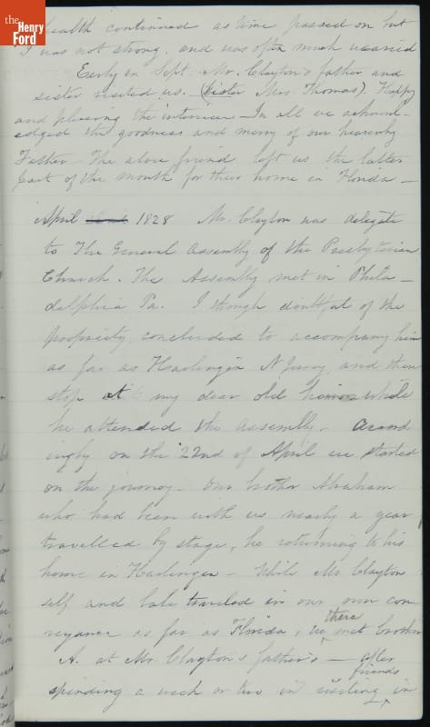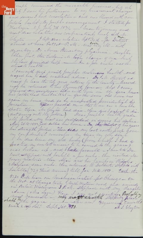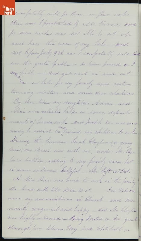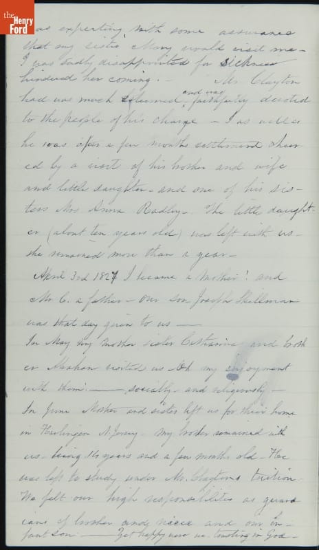 Margaret Skillman Clayton (1803-1894) recounts her life as a minister's wife in this 1883 hand-written autobiography. Margaret was born in New Jersey and became a school teacher before marrying Reverend Joshua Anderson Clayton in 1826. The couple had several children and moved often--Rev. Clayton served several churches in New York and later in Michigan. Margaret's personal narrative chronicles her family's journey in 19th-century America.