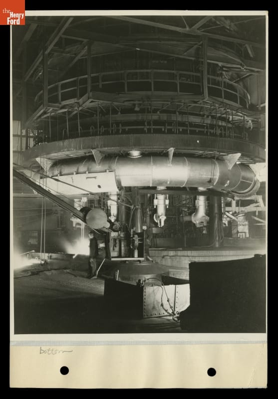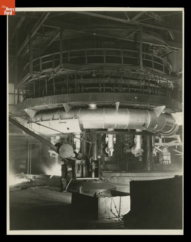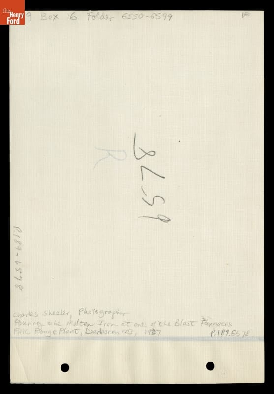 In 1927 Ford Motor Company commissioned Charles Sheeler to do a series of documentary photographs of its River Rouge industrial complex near Dearborn, Michigan. This photograph shows a blast furnace cast house. The bustle pipe, used to blast hot air into the furnace, encircles the base. Sheeler captures the breathtaking moment when the brightly shining molten metal illuminates the interior.