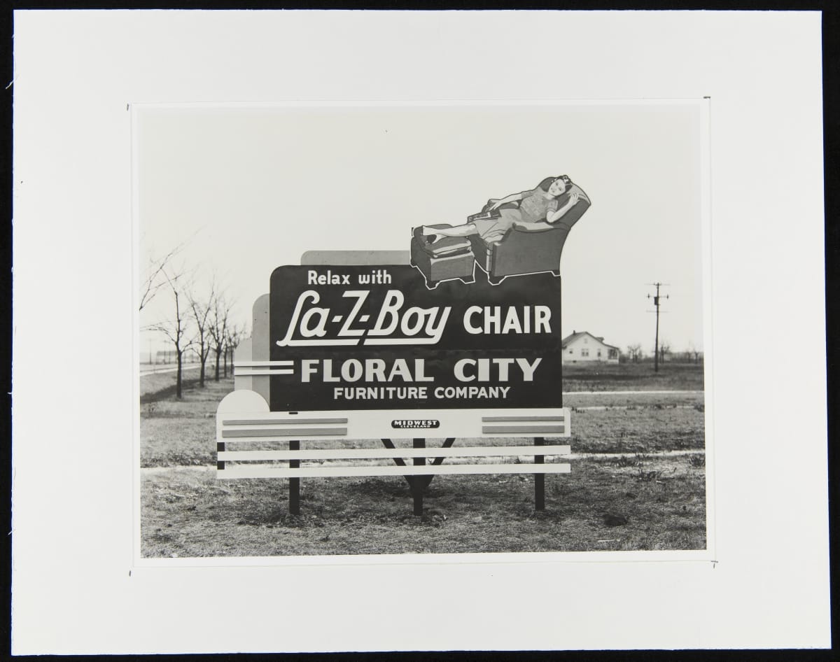 In 1927, cousins Edwin Shoemaker and Edward Knabusch established a successful furniture company (La-Z-Boy). Knabusch concentrated on marketing the company's products though both traditional media and his own unique approaches. The billboard seen in this photograph presented the technological innovation of the La-Z-Boy reclining chair -- but with a marketing twist: the illustration of the chair in use extends above the billboard to capture attention.
