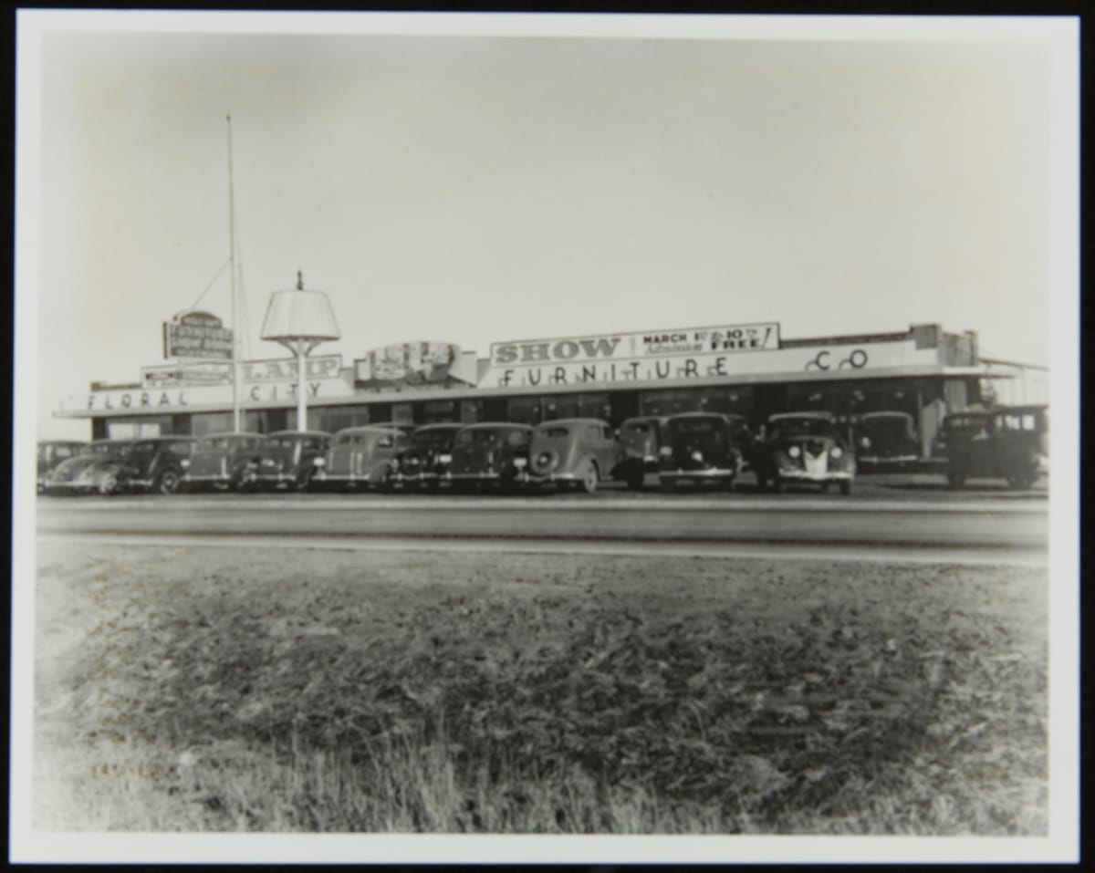 In 1927, cousins and business partners Edwin Shoemaker and Edward Knabusch established a successful furniture company (La-Z-Boy) through a combination of invention and marketing savvy. From the start of the partnership, Edward Knabusch developed and implemented innovative marketing strategies. This photograph shows "the world's largest lamp," created to draw attention to the cousins' Floral City Furniture store in Monroe, Michigan.