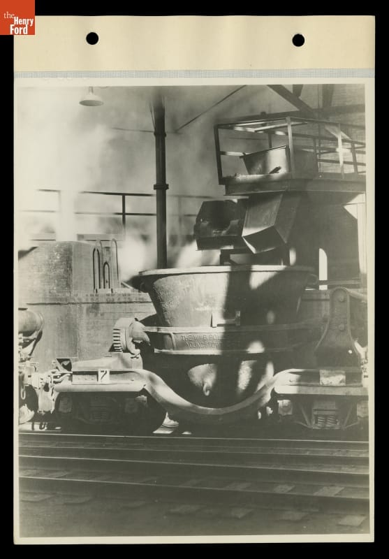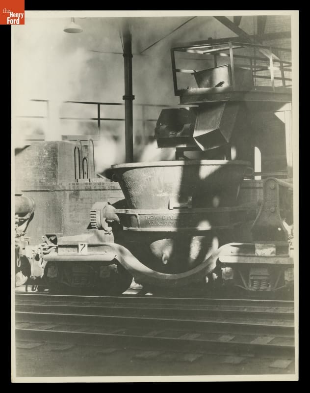 Steel production at Ford's Rouge Plant encompassed every step from start to finish. Two massive blast furnaces operated 24 hours a day to feed a unique process that rarely allowed molten iron to cool before steelmaking or casting. Instead, ladles on railroad tracks waited below the furnaces to be filled with up to 75 tons of the lava-like metal for transport.