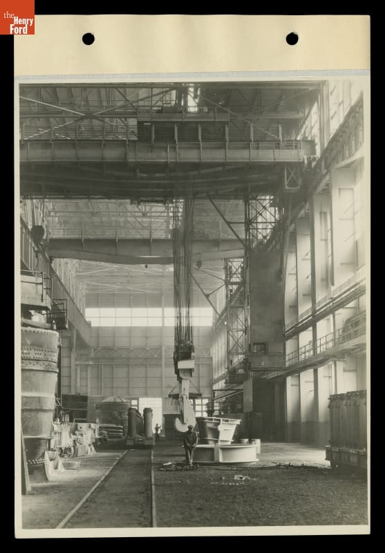 A worker shovels debris in the Ford Rouge Plant's open-hearth building, where ten monstrous furnaces worked day and night to produce steel for plant operations. Suspended behind him is the giant hook of a 125-ton crane. Its job was to transport massive ladles (one is partially visible, left) of molten metal through the steelmaking process.