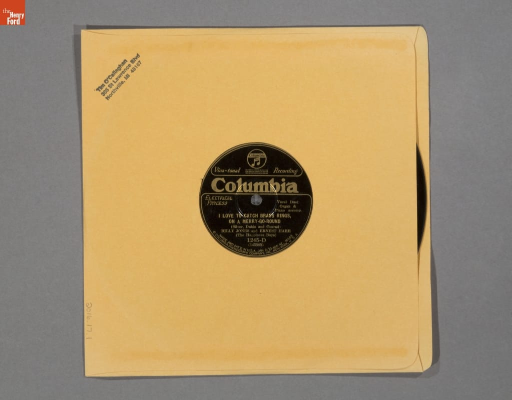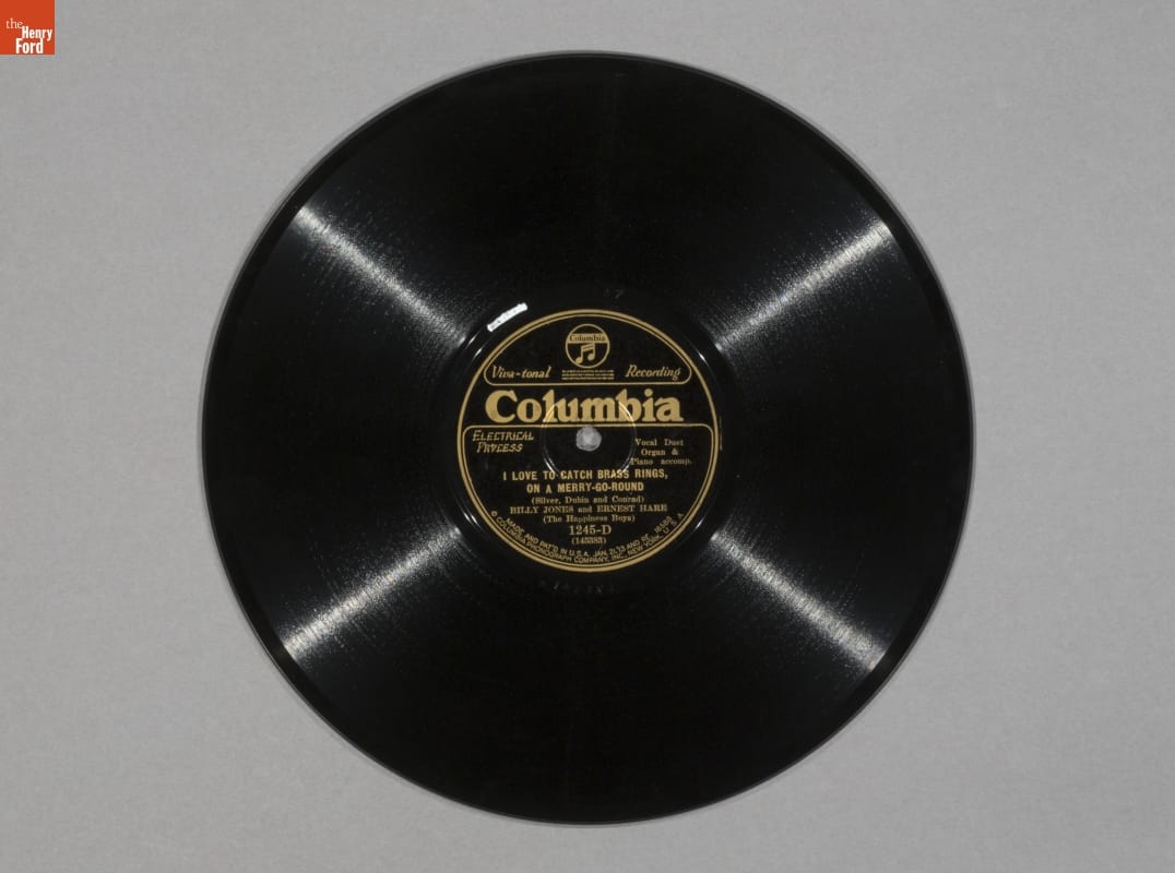 Viva-tonal Recording / Columbia / Electrical Process / Vocal Duet / Organ & Piano accomp. / I LOVE TO CATCH BRASS RINGS, ON A MERRY-GO-ROUND / (Silver, Dubin and Conrad) / BILLY JONES and ERNEST HARE (The Happiness Boys) / 1245-D (145383) / MADE AND PAT'D IN U. S. A. JAN. 21. '13 AND RE. 16588 / COLUMBIA PHONOGRAPH COMPANY, INC., NEW YORK, U. S. A.