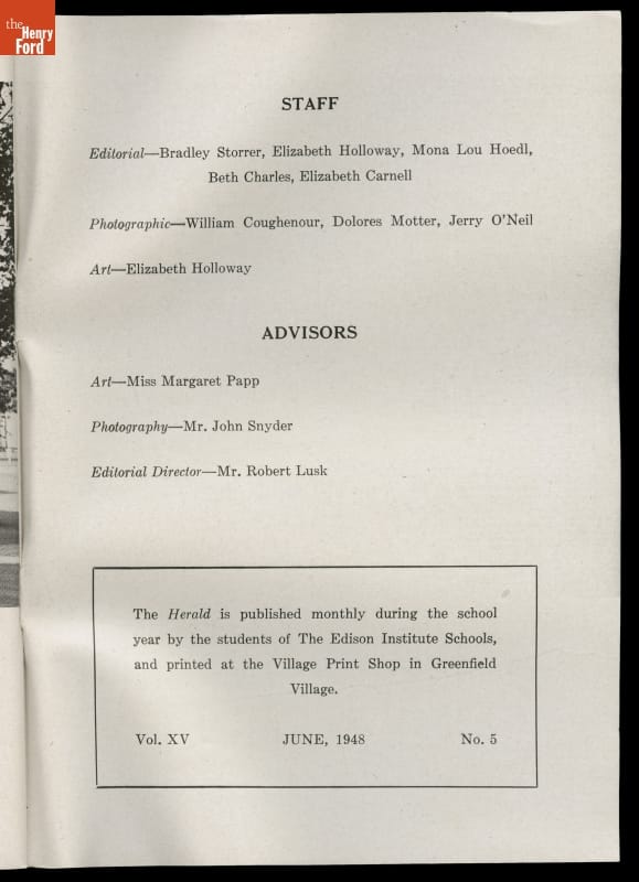 The students of the Greenfield Village and Associated Schools of the Edison Institute began publishing the Herald in 1934. They took the name from a weekly newspaper printed and sold by Thomas Alva Edison when he worked for the Grand Trunk Railroad in 1862-63. The students' version included articles on academic, social, and recreational activities. The publication continued until 1952.