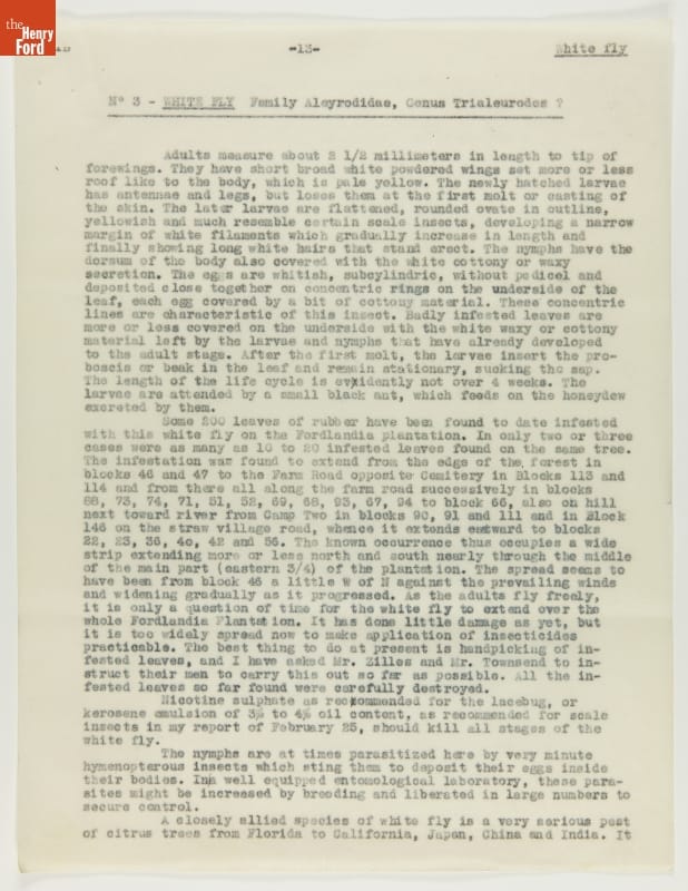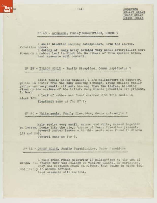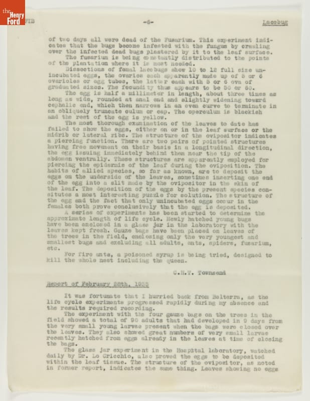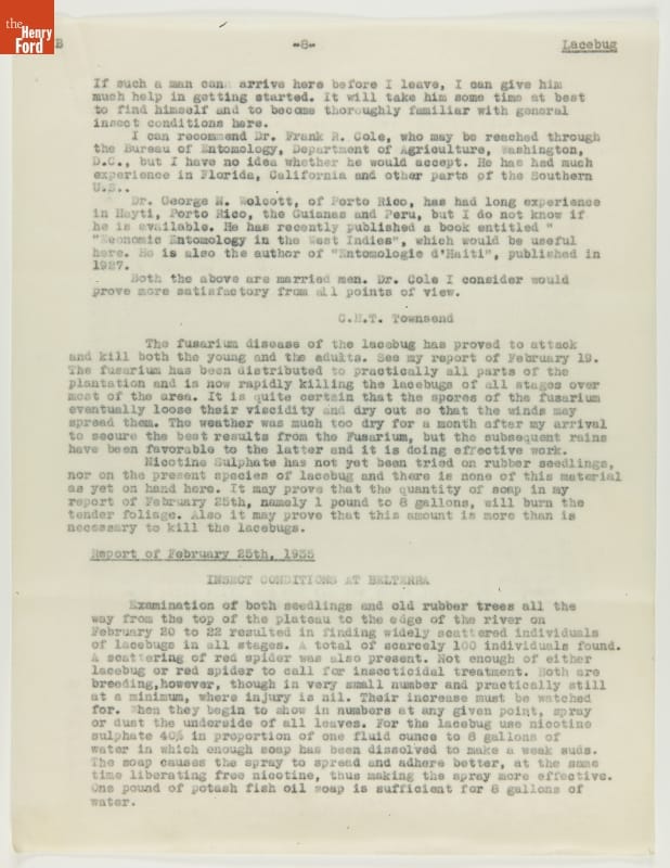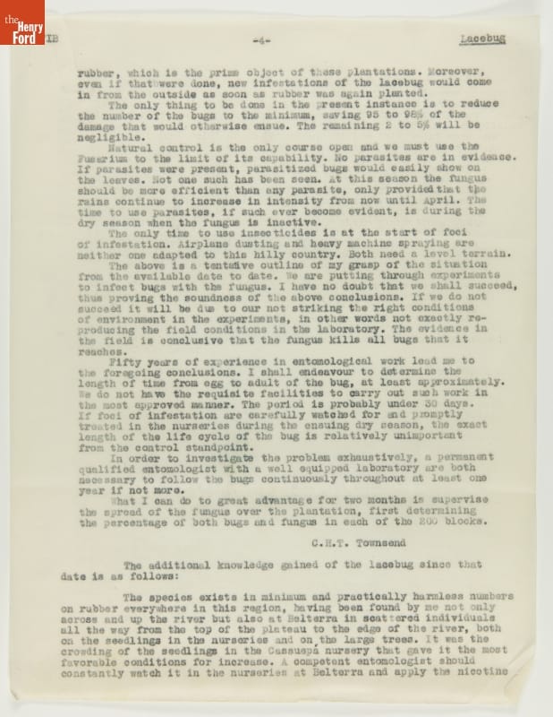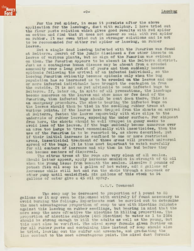 From 1928 to 1945 Henry Ford tried, unsuccessfully, to establish productive rubber plantations at his Brazilian settlements of Fordlandia and Belterra. Set in the Amazon jungle, the plantations of trees were under constant threat from a multitude of tropical pests and diseases. Charles Townsend, an entomologist well-versed in the insects of Brazil, was brought in by Ford to address the pest problem.