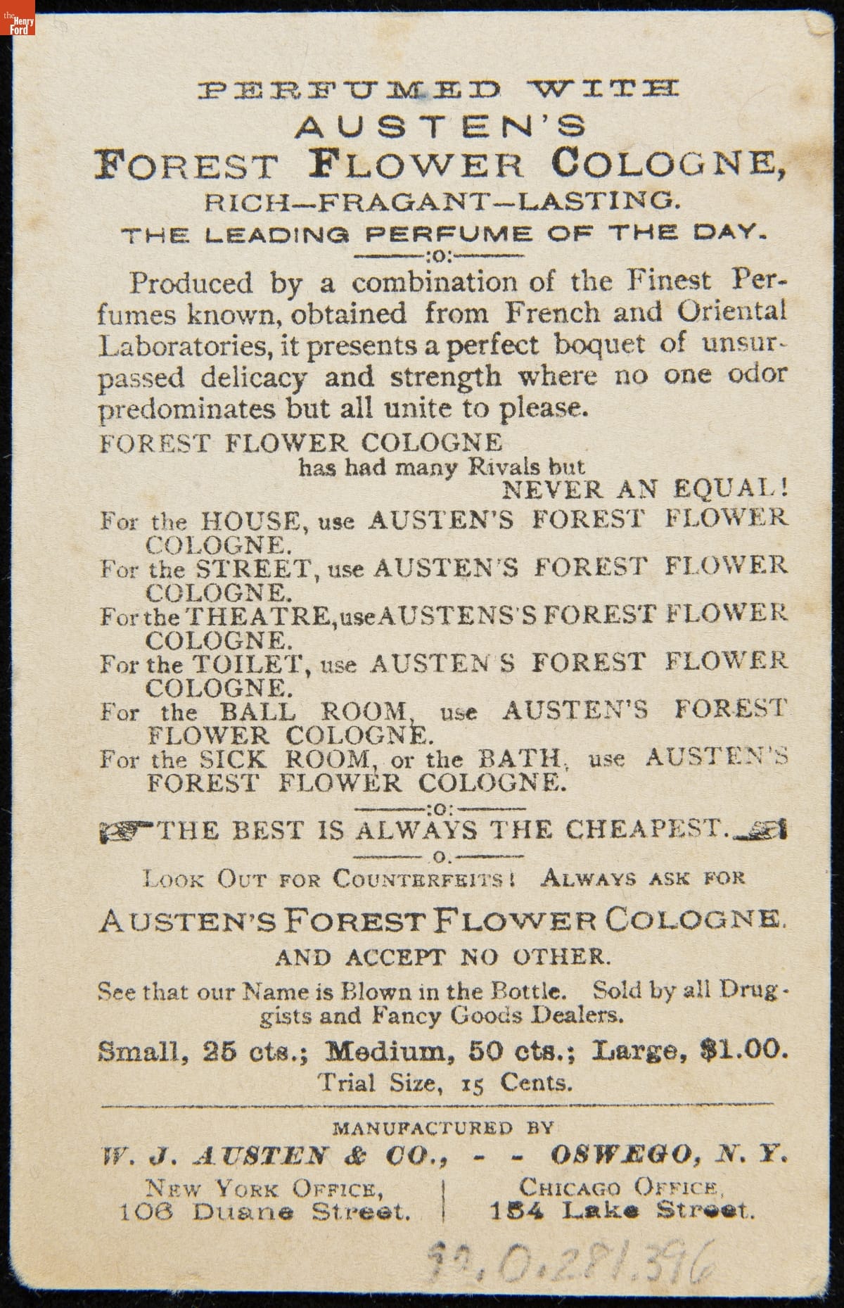 Trade Card for Austen's Forest Flower Cologne, W.J. Austen & Co., 1885