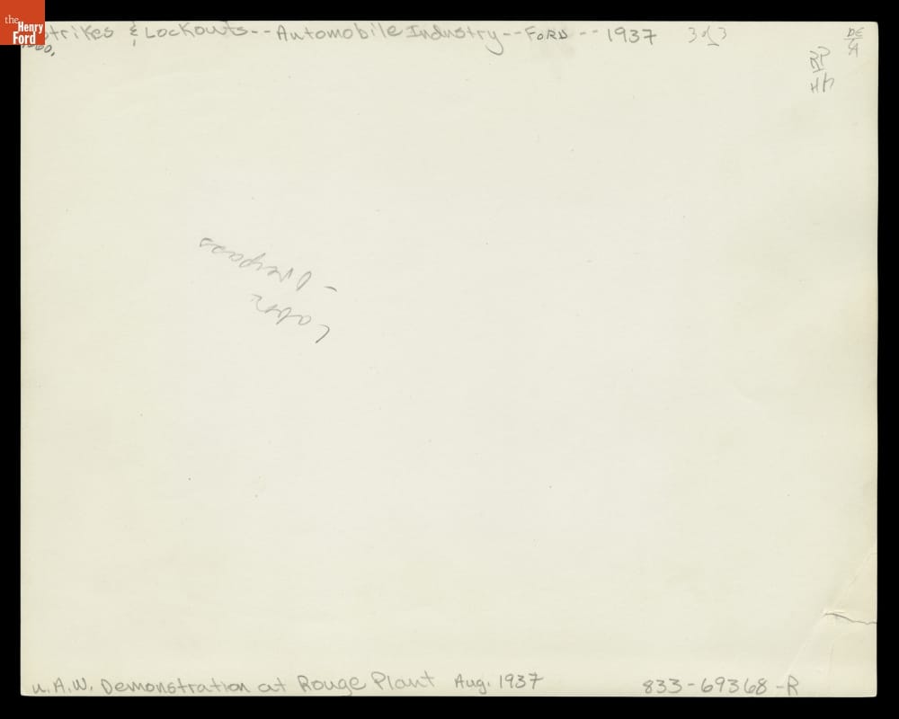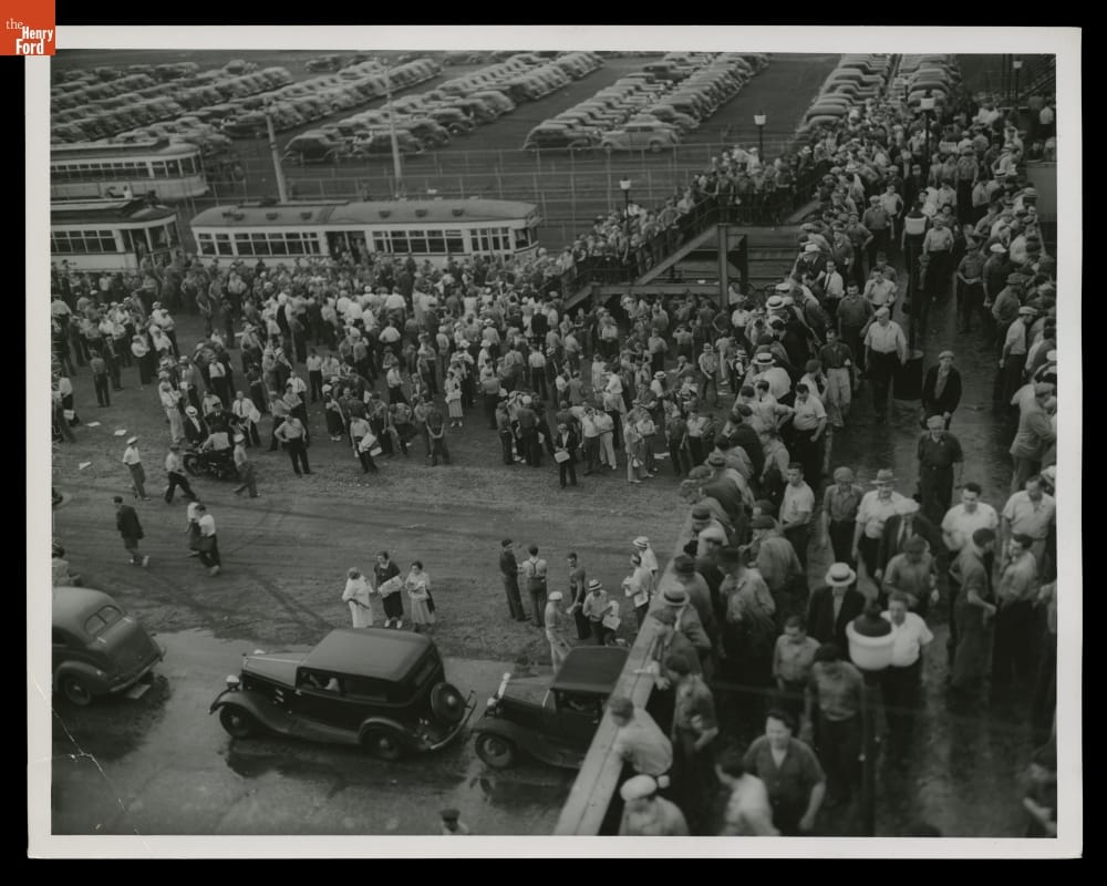 The struggle to unionize Ford Motor Company workers was long and--at times--violent. This photograph shows labor organizers distributing United Auto Workers (UAW) newspapers outside Ford's Rouge Plant pedestrian overpass in November 1937. Four years later, following a turbulent ten-day strike in April 1941, Ford became the last major automotive manufacturer to recognize the UAW and agree to a union contract.
