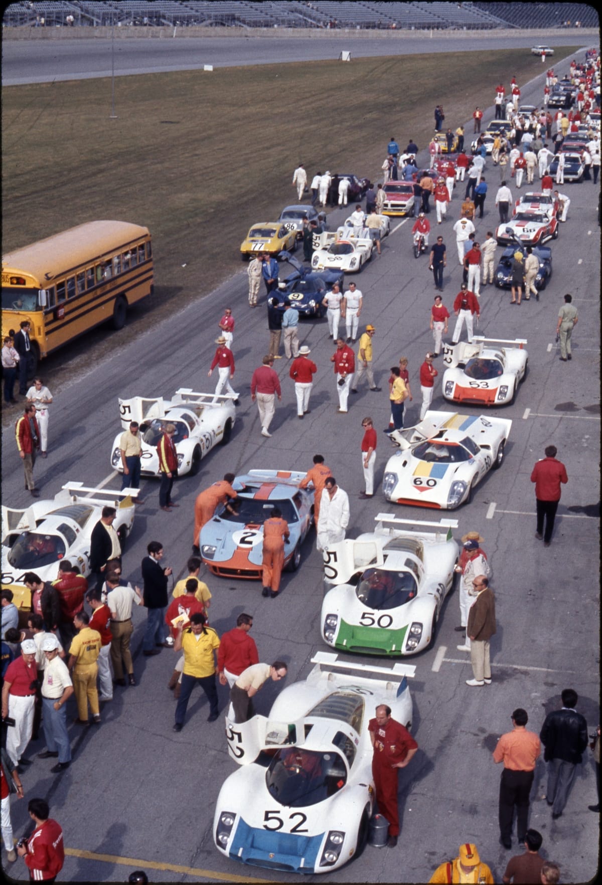 Dave Friedman has captured and preserved auto racing history through his own photography and his collection of works by other photographers. This image documents the race-day atmosphere surrounding the 1969 24 Hours of Daytona endurance race. An expected Porsche sweep vanished when all their factory cars failed to finish. A Roger Penske backed Lola, driven by Mark Donohue and Chuck Parsons, finished first.