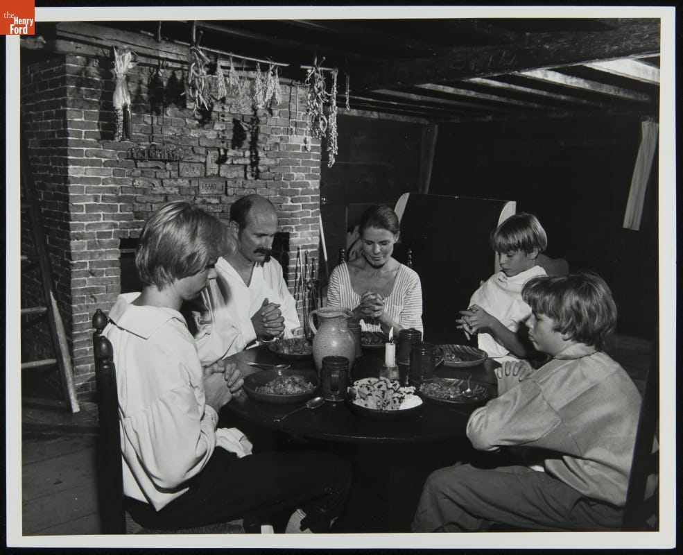 The Plympton House is one room with a loft. The central circular chimney was constructed first and the rest of the house was built around it. This design offered warmth from the harsh New England winters. The continual need to grow or make many of the things they needed left little time for luxuries for these early colonists.