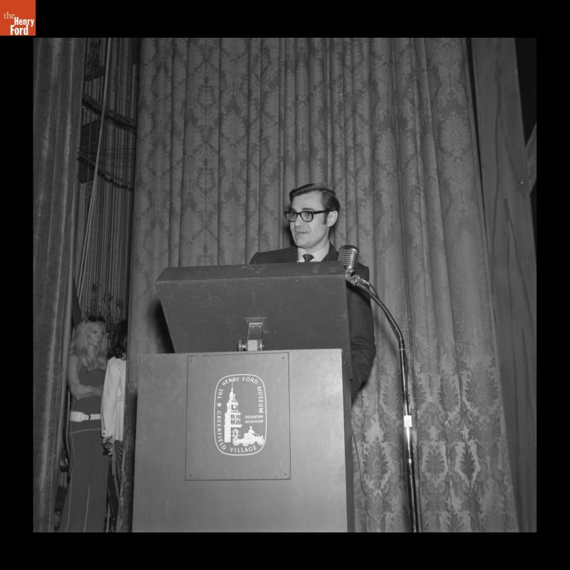 Dick Purtan Speaking at the Sports Car Fashion Show, Henry Ford Museum, February 9, 1970