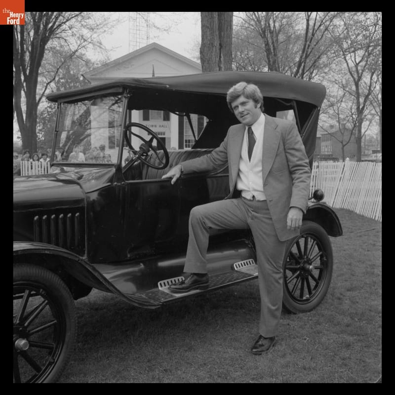 Television talk show host Phil Donahue recorded his program from the Henry Ford Museum and Greenfield Village from April 30 to May 4, 1973. The shows were taped inside Greenfield Village's Town Hall and on the Village Green. But not all his time was spent interviewing his guests; here Donahue poses alongside a Model T.