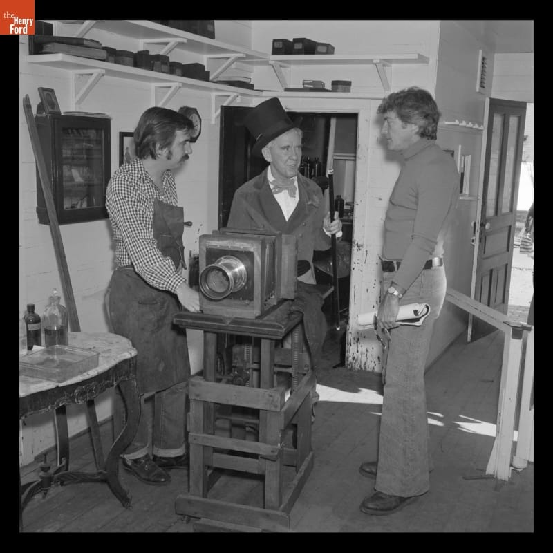 Burgess Meredith (center) While Filming in the Tintype Studio, Greenfield Village, 1976