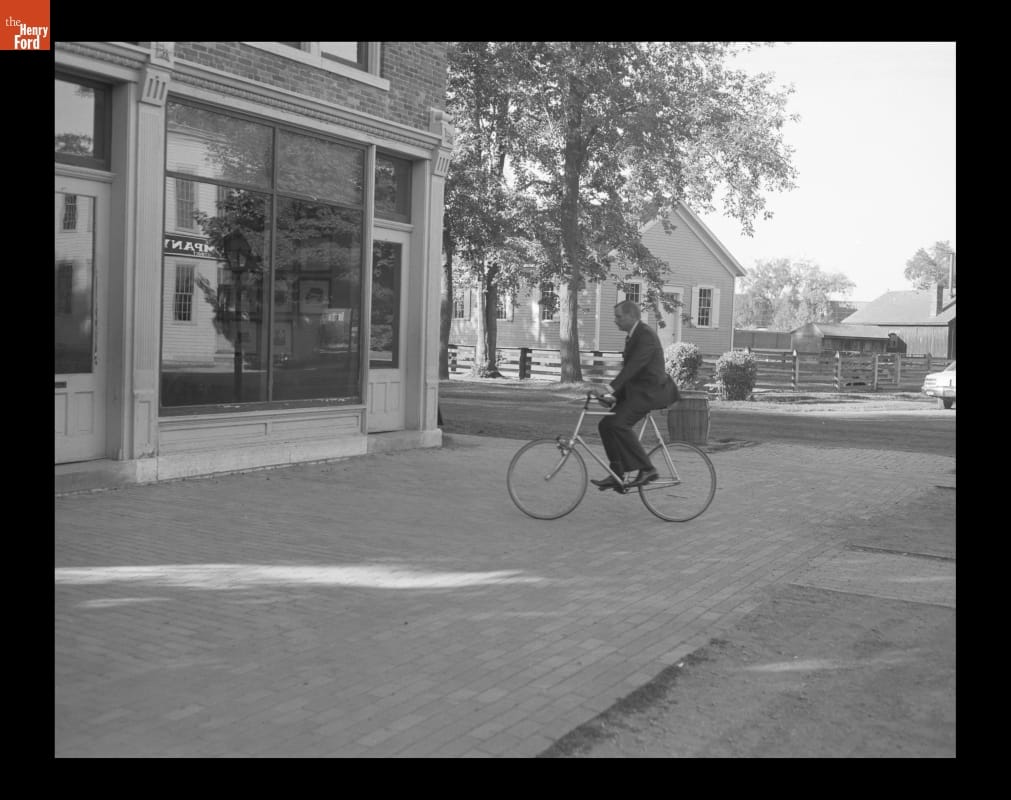 Astronaut Neil Armstrong, the first person to walk on the Moon, rode a bicycle around Greenfield Village during a 1979 visit. Armstrong and his Apollo 11 crewmates took pieces of the 1903 Wright Flyer on their 1969 mission -- to emphasize the incredible progress made in the 66 years between the Wright brothers' first flight and the lunar landing.