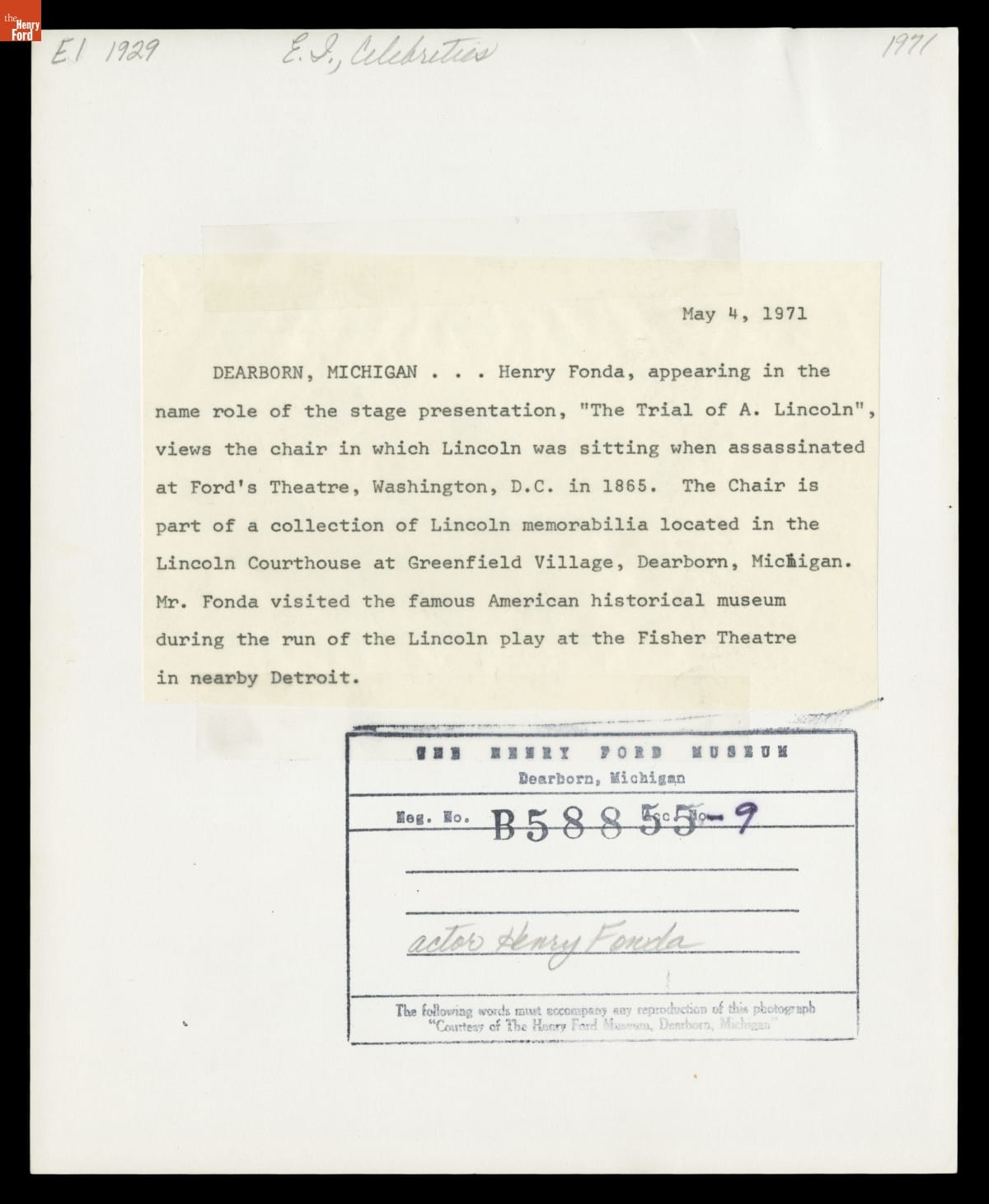 Many famous individuals have visited Greenfield Village and Henry Ford Museum. Actors, authors, and artists have passed through the entrance gates; business leaders, royalty, politicians, and a host of others have toured the exhibits. Photographs by the institution's photographer were taken if the celebrity allowed it. Henry Fonda, star of the 1939 film Young Mr. Lincoln, visited the Logan County Courthouse at Greenfield Village in 1971.