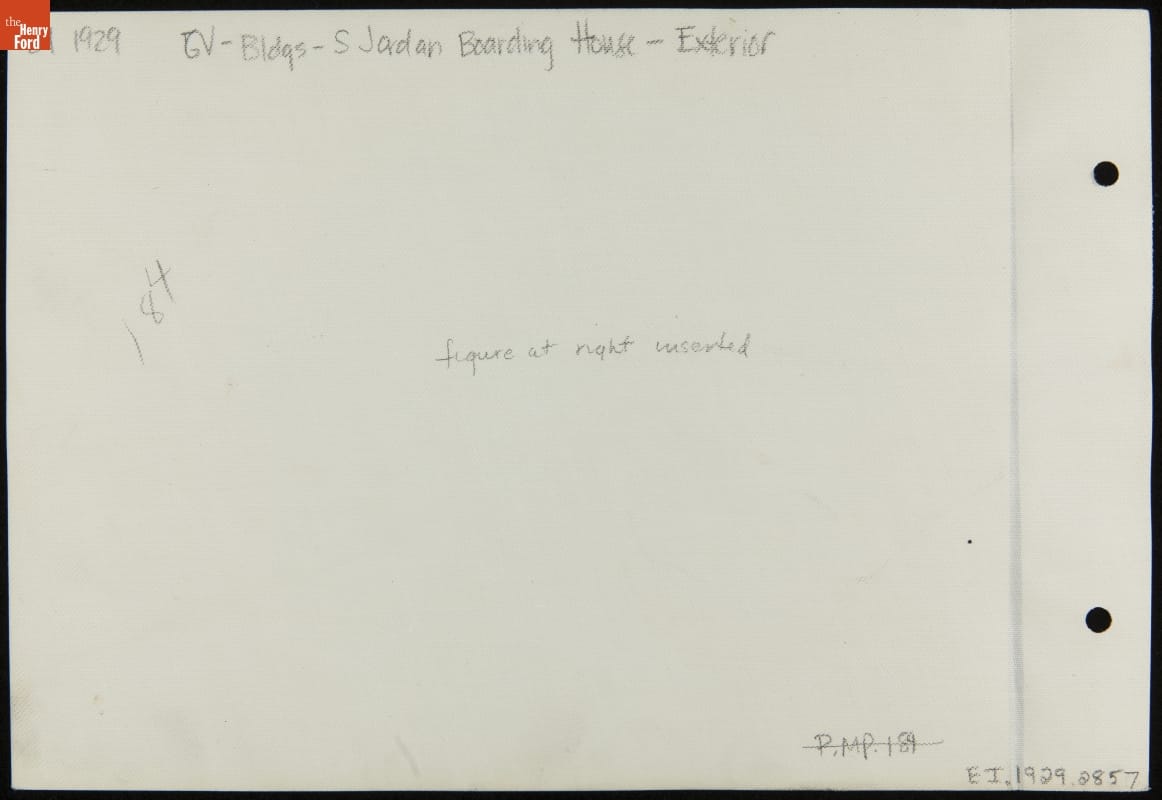 Charles Edison, Henry Ford, Anna Maria Osterhout Edison, William Meadowcroft, Thomas Edison, and Theodore Edison on the Porch of the Sarah Jordan Boarding House at its Original Site, Menlo Park, New Jersey, 1928