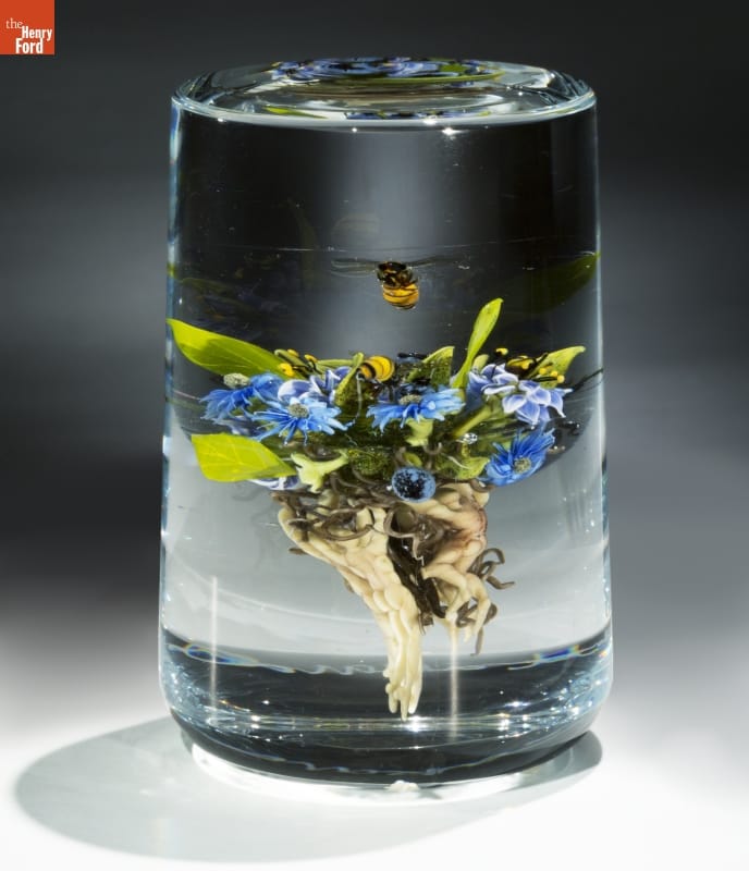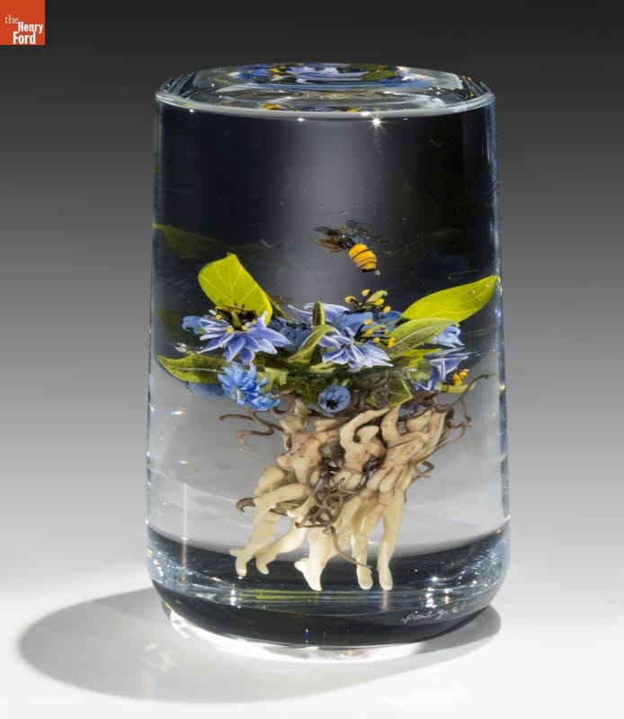 "Cylinder with Native Flowers, Honeybees, and Figures" by Paul J. Stankard, 2002