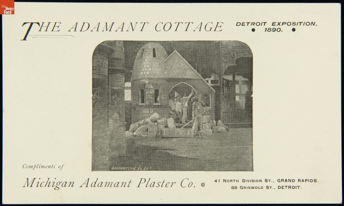 Trade Card for the Detroit Exposition's "Adamant Cottage," Michigan Adamant Plaster Co., 1889-1890
