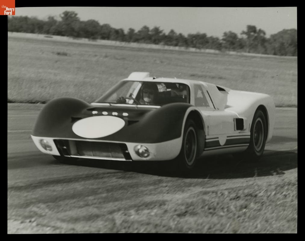 Ford Motor Company intended to compete at Le Mans in 1967 with the all-new J-Car, seen here during a trial at Riverside, California, in July 1966. Those plans changed in August 1966 when driver Ken Miles died in a rollover accident while testing a J-Car. Ford engineers and Shelby American specialists reworked the J-Car into the safer Mark IV.