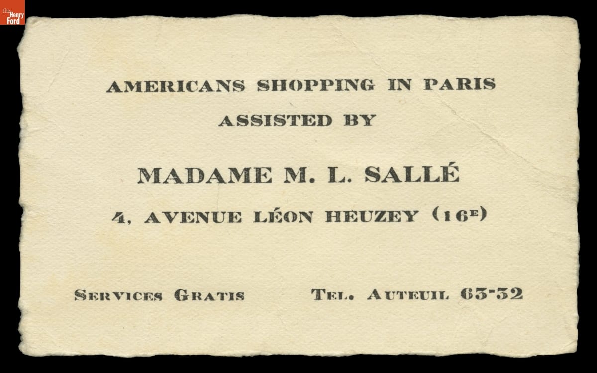 Business Card, "Americans Shopping in Paris Assisted By Madame M. L. Salle," 1928
