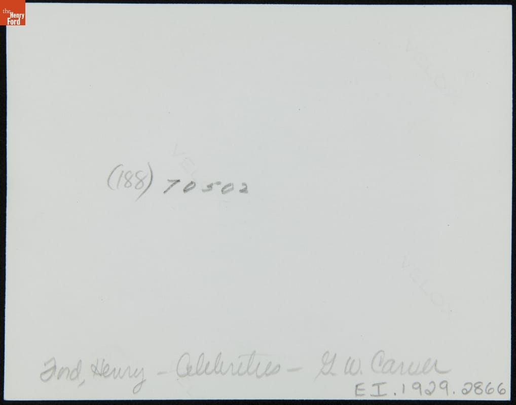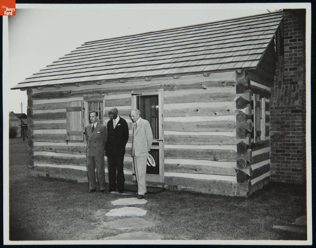Henry Ford, his son Edsel Ford, and agricultural scientist George Washington Carver stand in front of the Carver Memorial Cabin in Greenfield Village. Carver came to Dearborn in July 1942 for the dedication of this cabin, which Henry Ford built to honor his friend. The cabin is based on Carver's own sketches of the slave cabin in Missouri in which he was born.