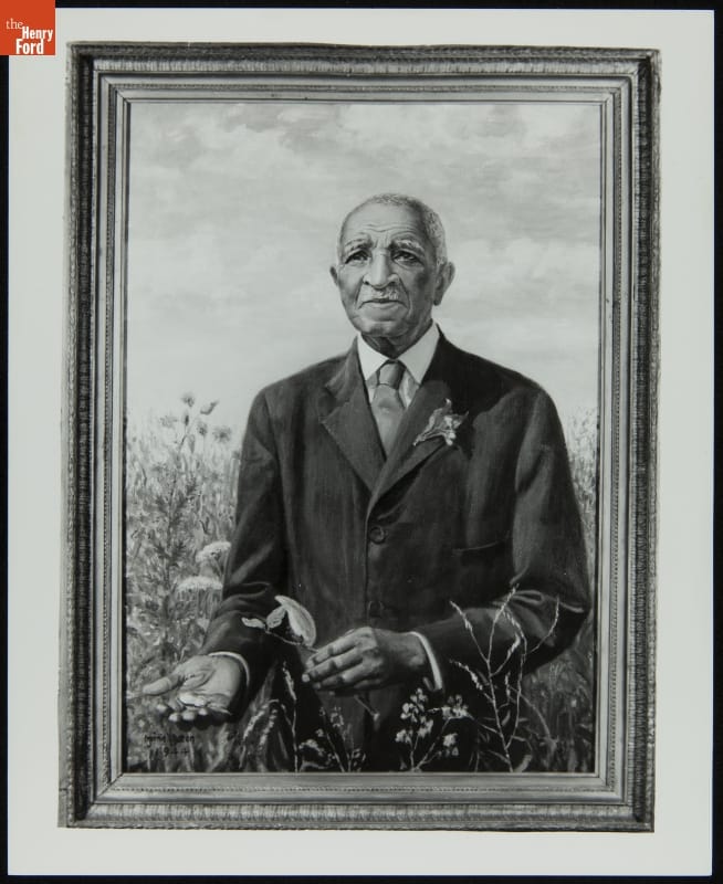 Henry Ford commissioned his personal artist, Irving Bacon, to paint a portrait of Ford's friend, the agricultural scientist George Washington Carver. Carver sat for the painting during his visit to Dearborn in 1942. This photographs documents the work. Carver, who loved plants, the soil, and farmers, is shown in a meadow wearing his customary old suit with boutonniere and holding a peanut and milkweed pod.