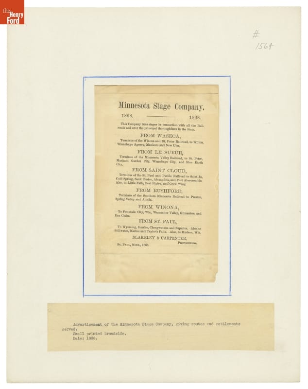 In 1859, J.C. Burbank and Co. of St. Paul combined with the firm of Allen and Chase to form the Minnesota Stage Company. By 1865 the Minnesota Stage Company held a monopoly of stage roads, controlling over 1,600 miles. This broadside advertises the routes in 1868.