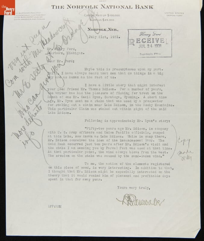 Letter from L.P. Pasewalk to Henry Ford regarding Prospector's Claim Stake Donated to Henry Ford Museum, 1931