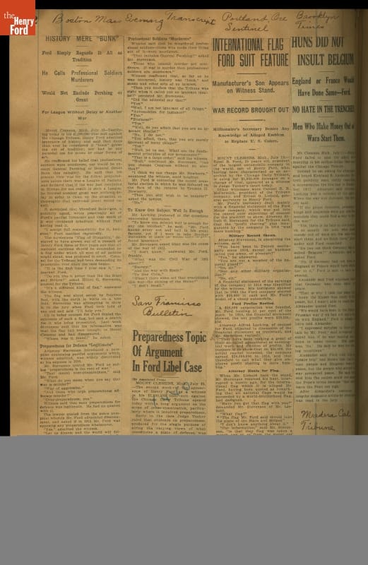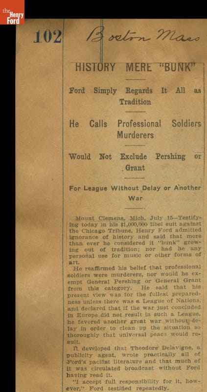 Henry Ford sued the Chicago Tribune for defaming his reputation with the headline "Ford is an Anarchist." During the trial in 1919, Ford's famous quote, "history is more or less bunk," was used to mock him. Henry Ford was not ignorant of history, but opinionated about it. To him, technology and everyday life were more important than war and politics.