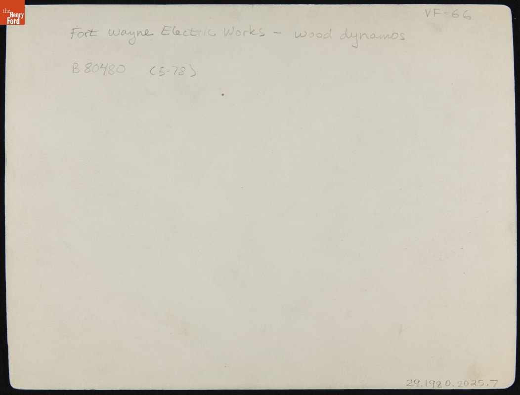 Established in 1881, the Fort Wayne Electric Corporation manufactured arc lamps, dynamos, and other lighting and electrical equipment. By 1894, the company had survived financial difficulties, a corporate reorganization, and a recent name change. Aided by well-respected electricians, engineers, and inventors, the Indiana company expanded and increased its production efforts. This photograph shows the arc dynamo and lamp testing department.