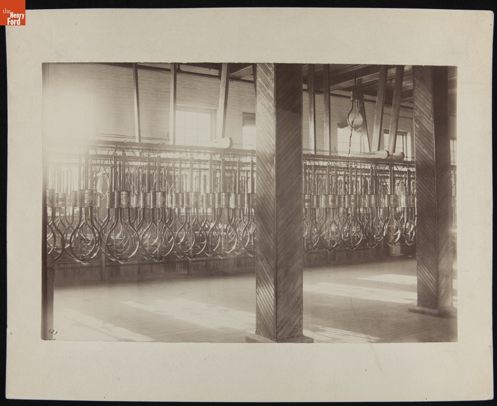 Established in 1881, the Fort Wayne Electric Corporation manufactured arc lamps, dynamos, and other lighting and electrical equipment. By 1894, the company had survived financial difficulties, a corporate reorganization, and a recent name change. Aided by well-respected electricians, engineers, and inventors, the Indiana company expanded and increased its production efforts. This photograph shows factory racks filled with arc lamps ready for testing.