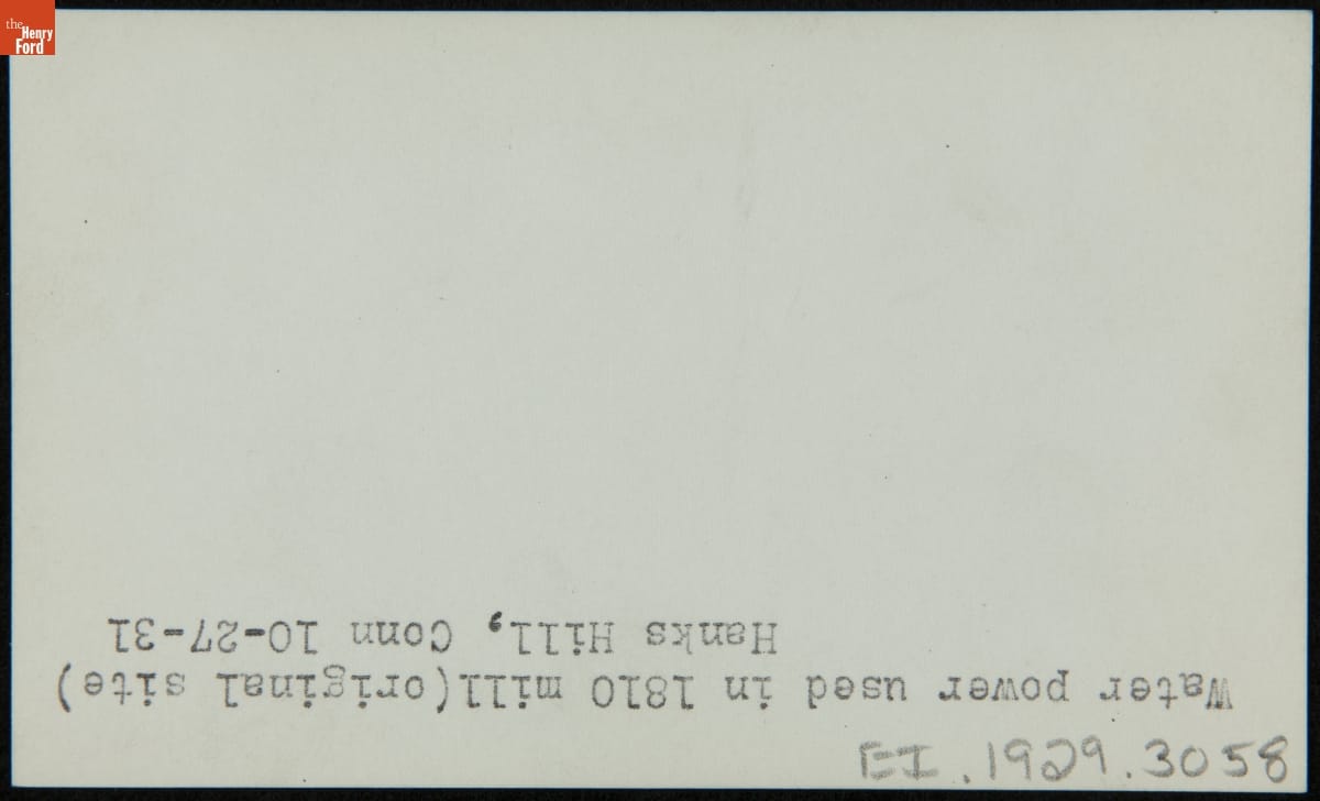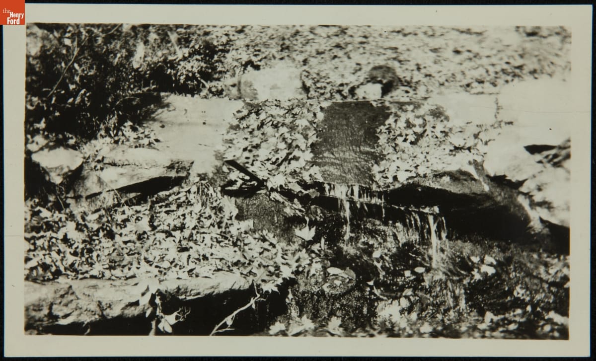 As America was taking its first steps towards industrialization, the Hanks family of Mansfield, Connecticut, made early attempts to mechanize the production of silk thread. In 1810, Rodney Hanks and his nephew Horatio Hanks built America's first water powered silk mill. Henry Ford moved the mill to Greenfield Village in 1932. This photograph shows the landscape from the mill's original site at that time.