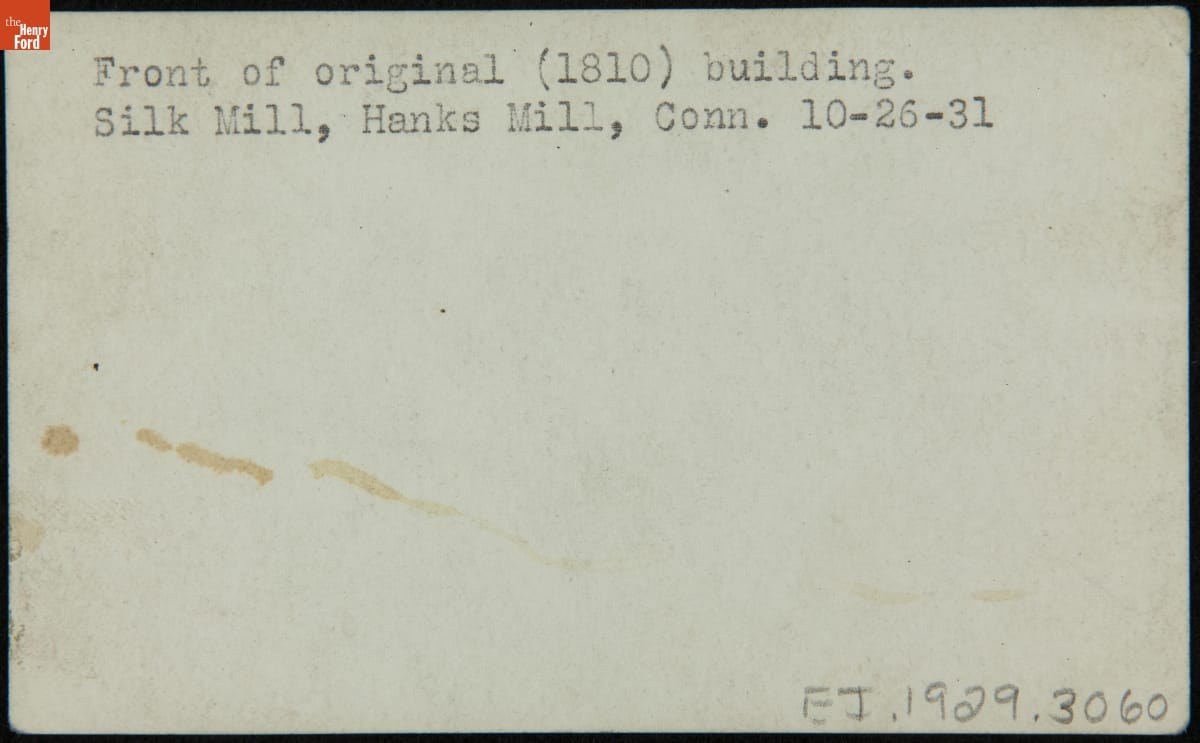 As America was taking its first steps towards industrialization, the Hanks family of Mansfield, Connecticut, made early attempts to mechanize the production of silk thread. In 1810, Rodney Hanks and his nephew Horatio Hanks built America's first water powered silk mill. Henry Ford moved the mill, seen here at its original location, to Greenfield Village in 1932.