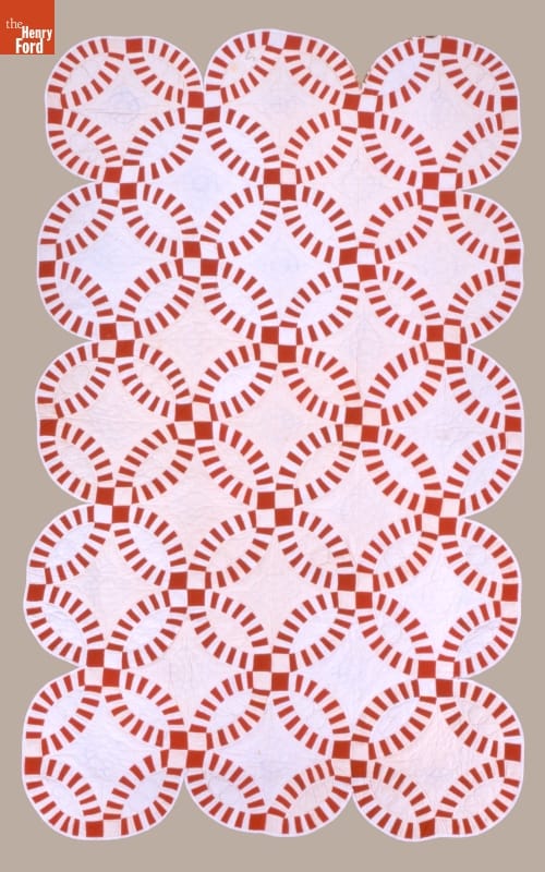 Quilting Pattern: Rings are outline quilted; small ovals between the rings quilted with two interlocking circles; larger area between rings quilted with one large petaled flower with four leaves