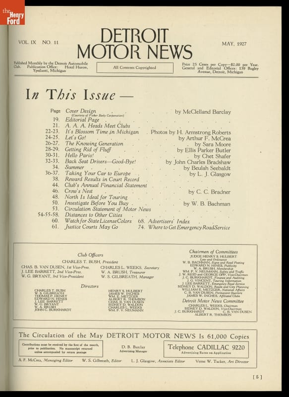 Published monthly by the Detroit Automobile Club, Detroit Motor News kept readers informed on a variety of automotive topics. Content included previews and reviews of auto shows, observations on motor vehicle insurance and regulations, and travel logs recounting road trips in the United States and abroad. Issues featured general-interest stories as well.