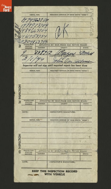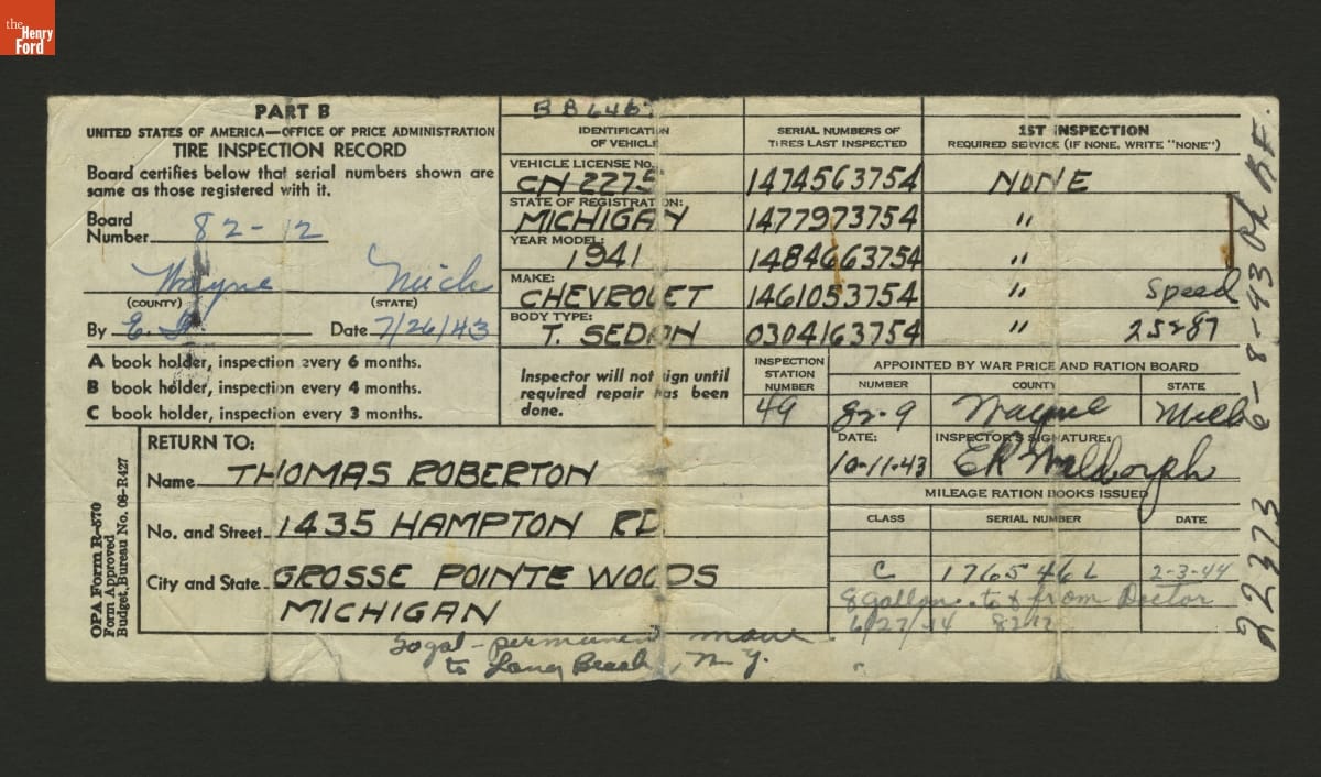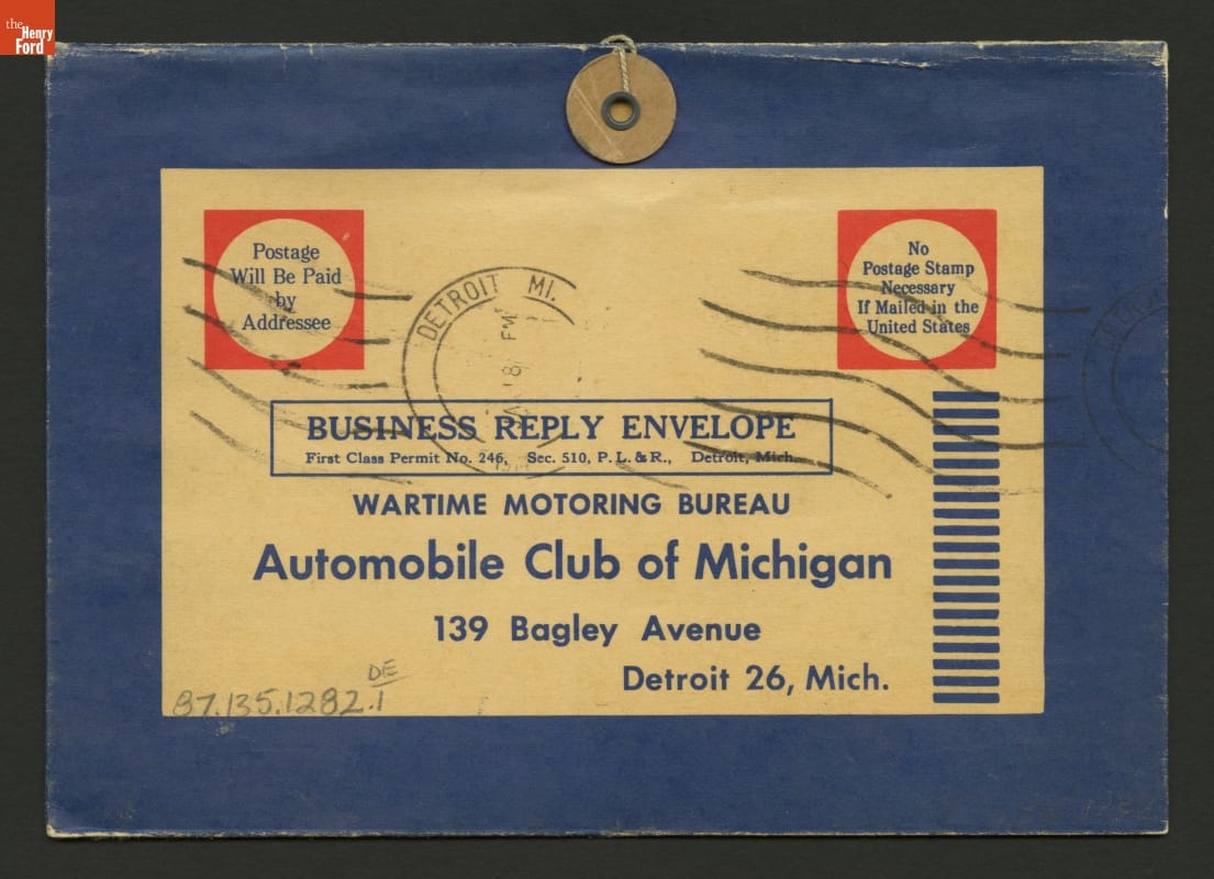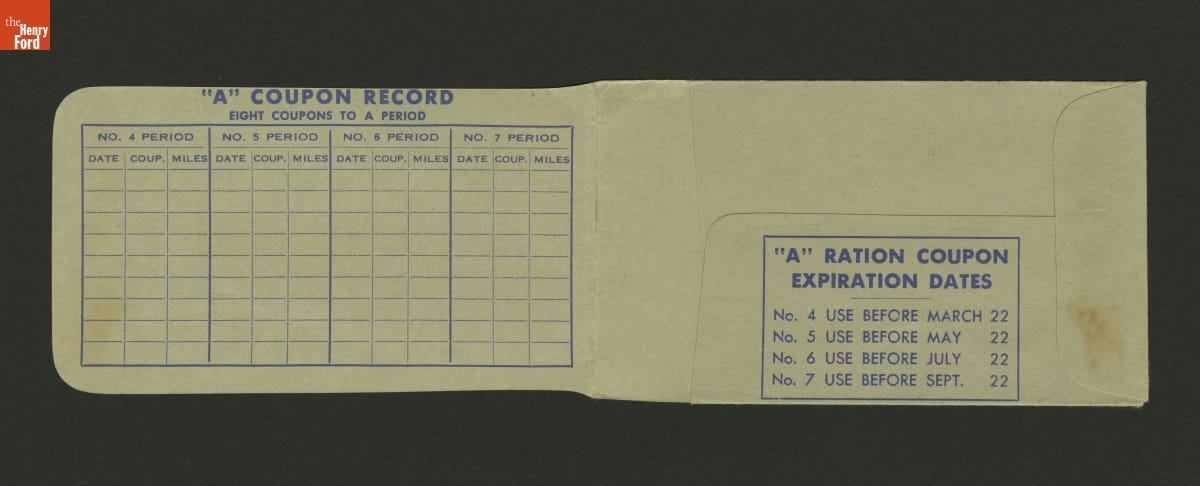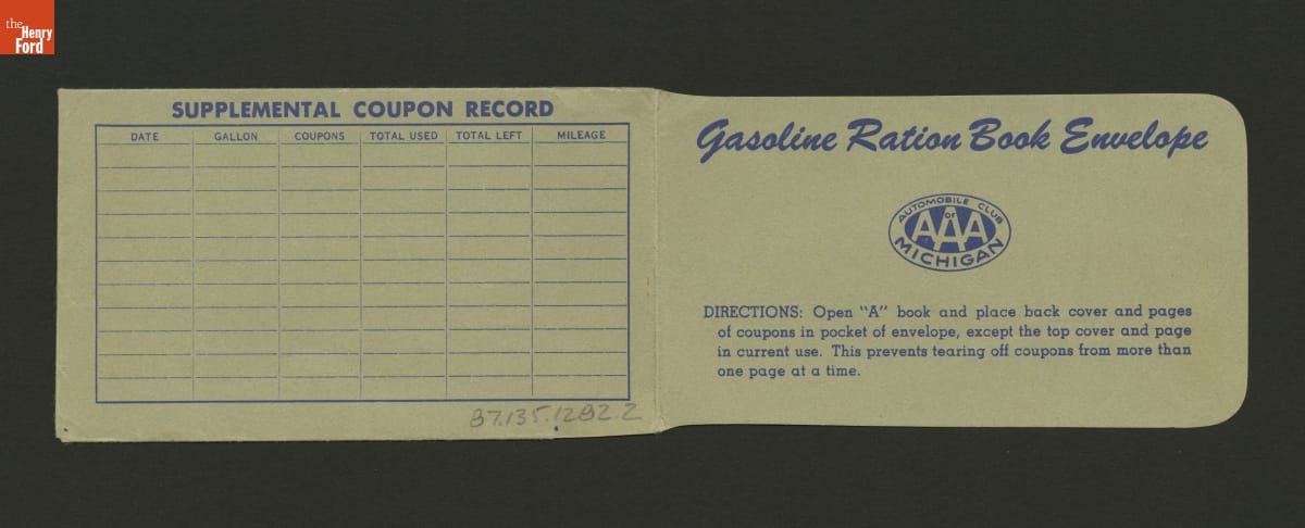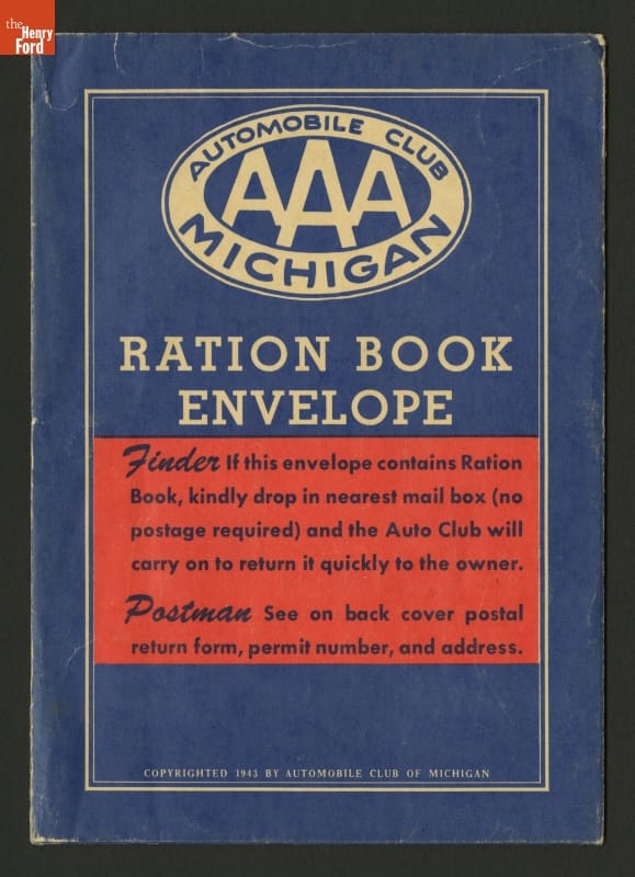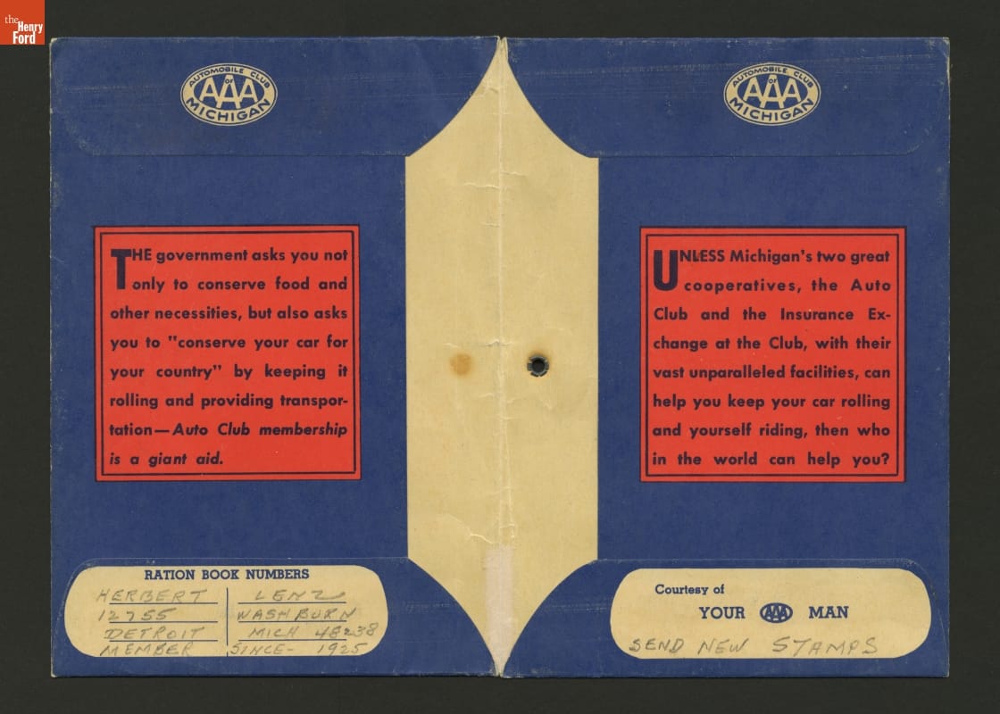 The Automobile Club of Michigan (AAA Michigan) provided this ration book wallet to drivers during the Second World War. Members could use it to store ration coupons and other documents needed for the wartime operation of their automobiles.
