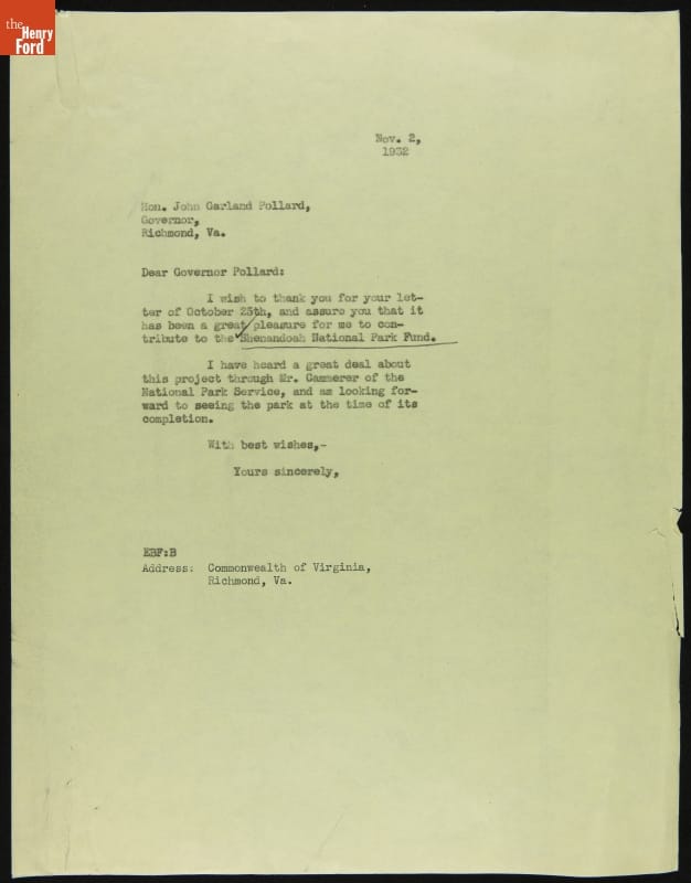 Letter from Edsel Ford to John Garland Pollard regarding Donation to Shenandoah National Park, November 2, 1932
