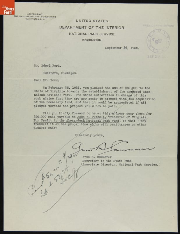 Letter from Arno Cammerer to Edsel Ford regarding Donation to Shenandoah National Park, September 26, 1928