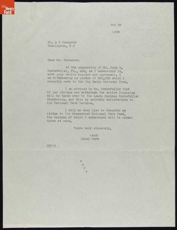 After becoming friends with philanthropist John D. Rockefeller, Jr., Edsel Ford began to partner with him on numerous charitable efforts, including donating money to establish Great Smoky Mountains National Park. When Rockefeller found another way to completely cover the cost of the park, he suggested Ford transfer his donation over to Shenandoah National Park, to which Ford obliged.
