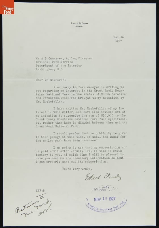 Letter from Edsel Ford to Arno Cammerer regarding Donation to Great Smoky Mountains National Park, November 14, 1927