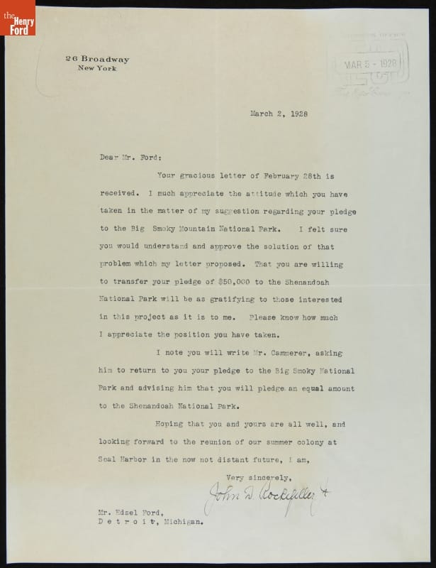 Letter from John D. Rockefeller Jr. to Edsel Ford regarding Donation to Great Smoky Mountains and Shenandoah National Parks, March 2, 1928