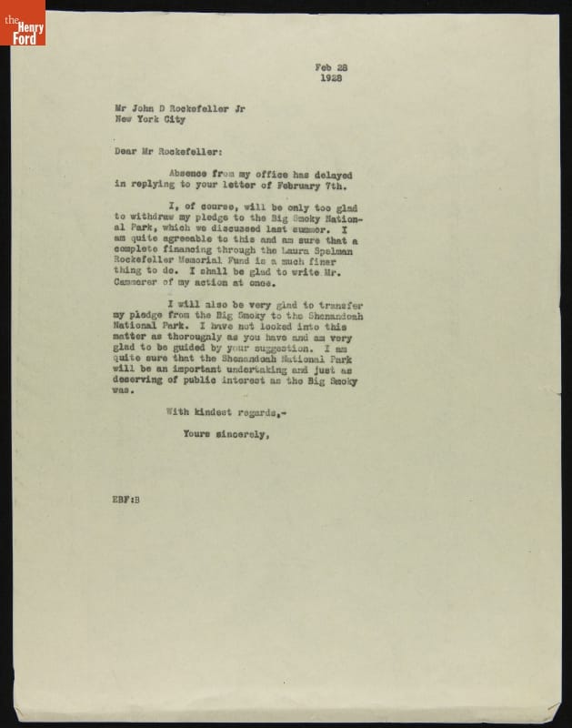 Letter from Edsel Ford to John D. Rockefeller Jr. regarding Donation to Great Smoky Mountains and Shenandoah National Parks, February 28, 1928
