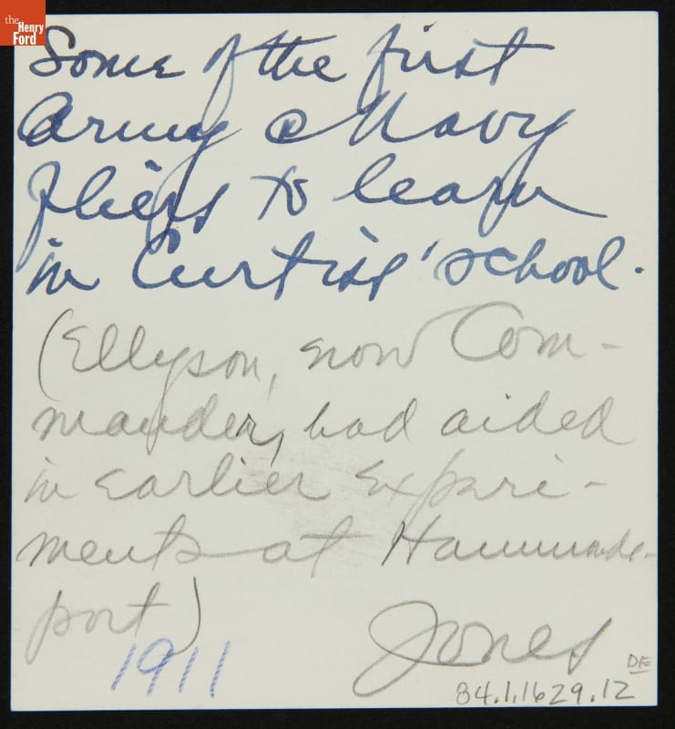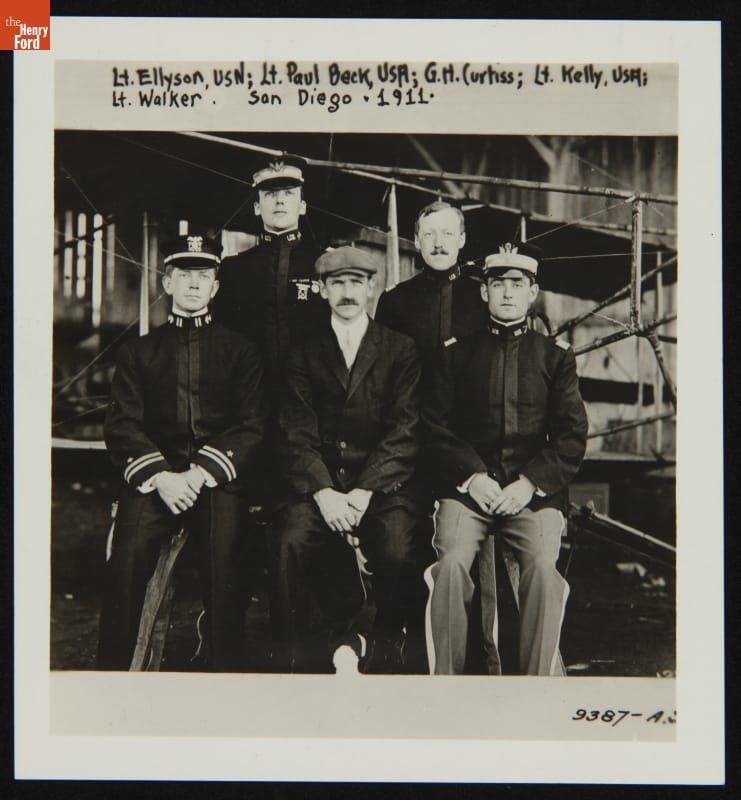 Lt. Ellyson, USN; Lt. Paul Beck, USA; G. H. Curtiss; Lt Kelly, USA; / Lt Walker. San Diego 1911