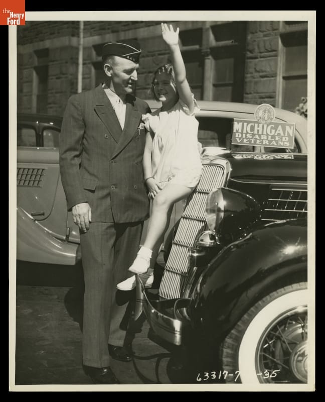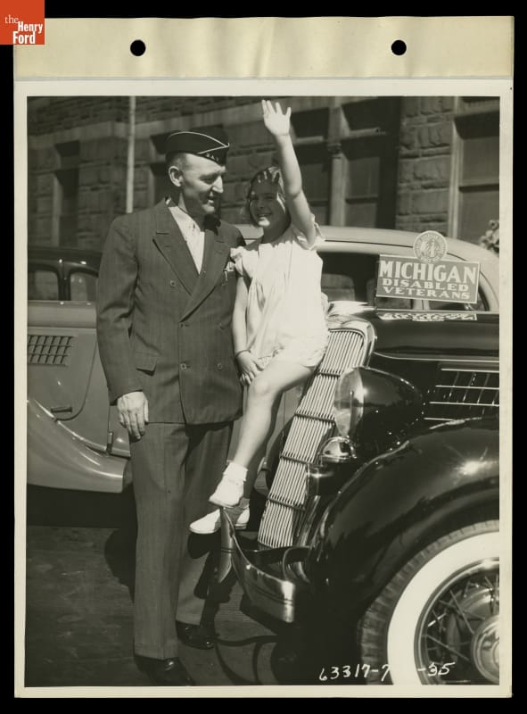 Michigan Disabled Veteran Posing with Little Girl, Ready to Depart for American Legion Convention, 1935