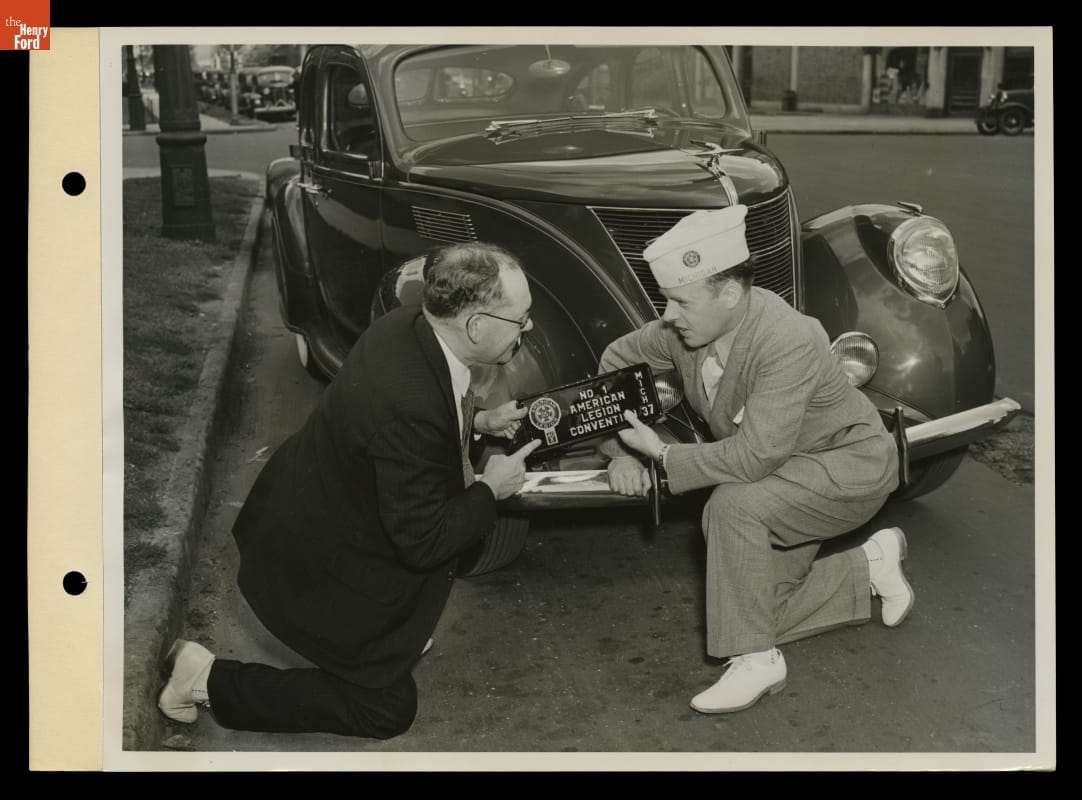 Michigan Secretary of State Leon Case and Guy Cox with an American Legion License Plate, 1937