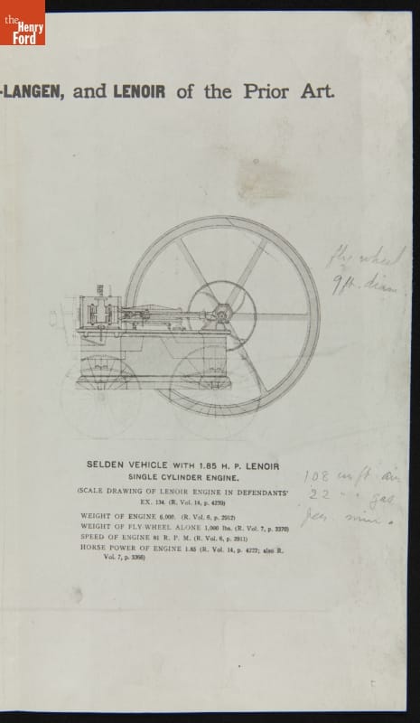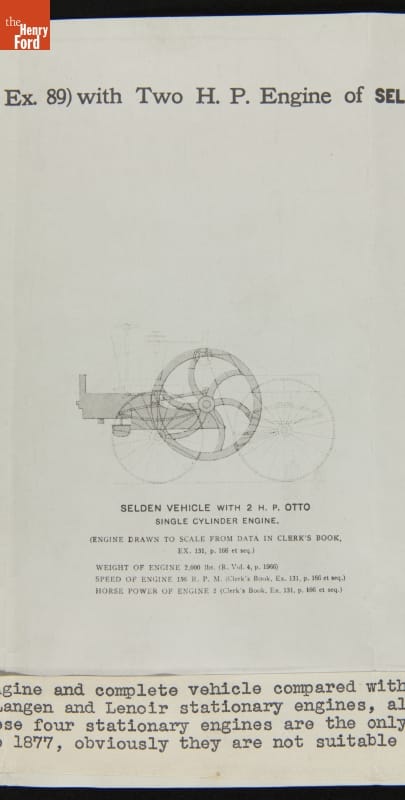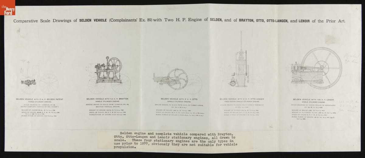 George Selden conceived -- but didn't build -- a vehicle powered by a two-stroke gasoline engine in 1877, and he received a patent in 1895. The Association of Licensed Automobile Manufacturers enforced Selden's patent, but Henry Ford successfully fought ALAM in court. These drawings, prepared for the suit, compared Selden's proposed vehicle with various engines available in the mid-1870s.