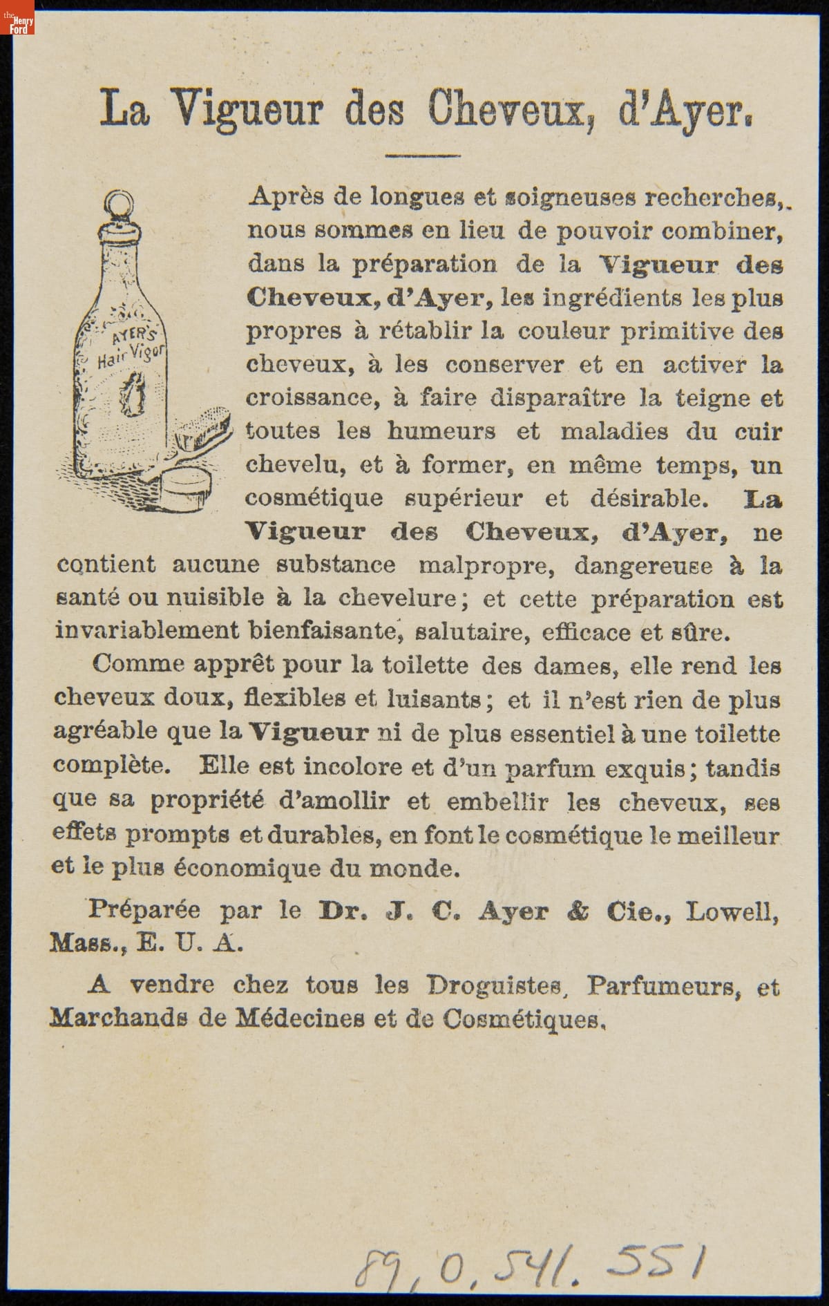 James C. Ayer (1818-1878), a purveyor of patent medicines in the 19th century, claimed his treatments could cure colds, coughs, and other ailments, purify the blood, and invigorate the hair. Ayer--and later his company--successfully marketed his products by printing thousands of trade cards, almanacs, and newspaper and magazine ads. Ayer's company continued production well into the 20th century.