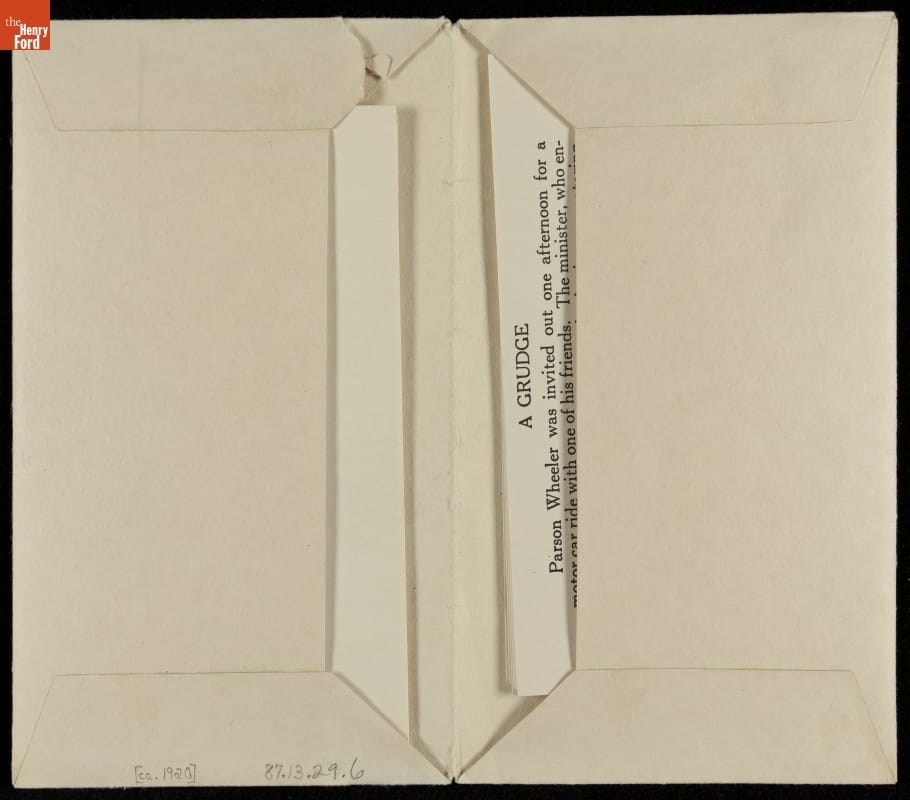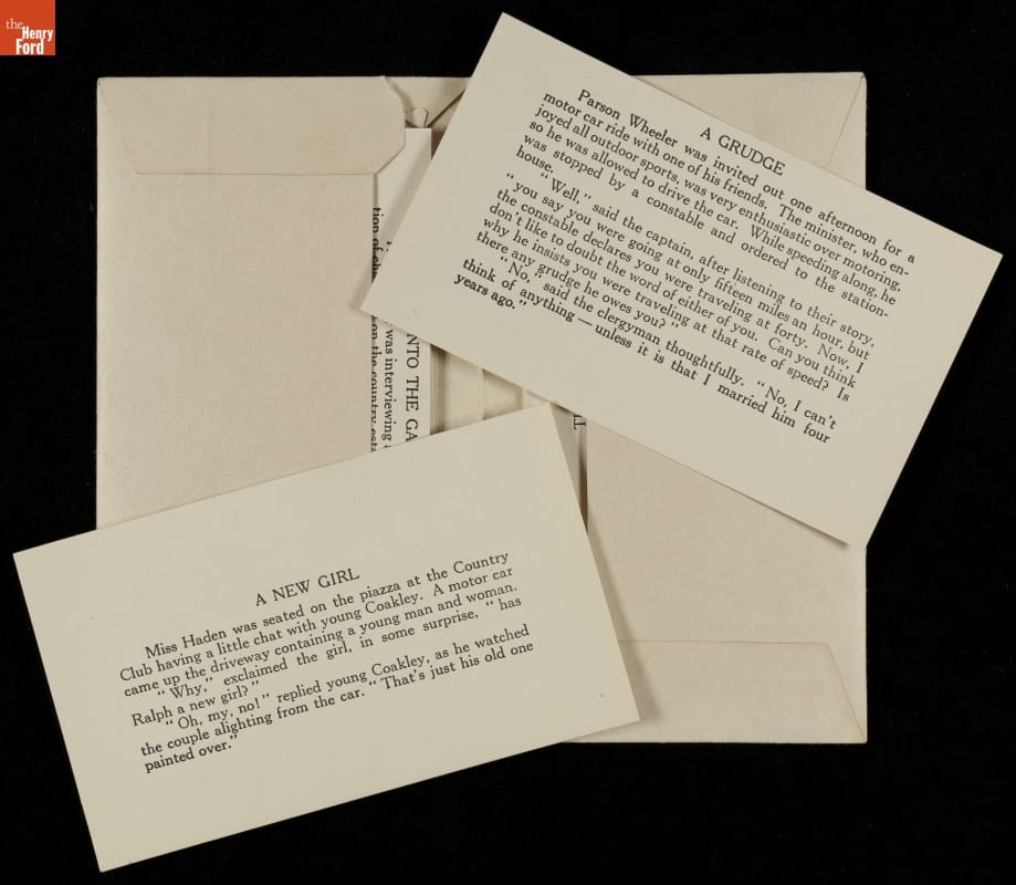 Rust Craft Publishers, a greeting card company, manufactured this set of novelty cards for motorists. The cards contain humorous stories related to the automobile. The cards could help pass the time on long drives or give the motorist a little cheer when "something is the matter" with the vehicle.