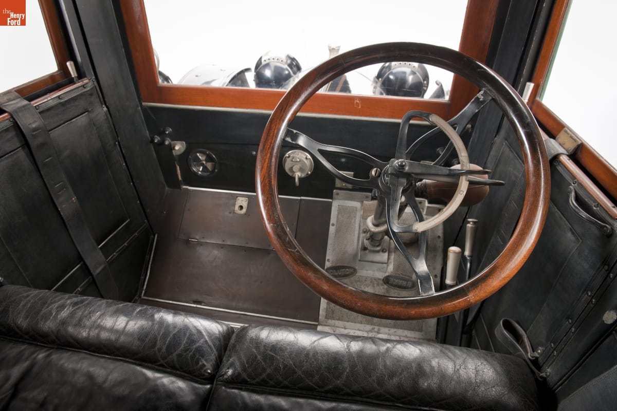 This limousine was designed to make a grand entrance. And it wasn't short on style either. Owners gazed through French plate-glass windows lined with silk curtains. They enjoyed an umbrella holder, a hat rack, a flower vase, and interior electric lights. Even the chauffeur's compartment was done up in leather and mahogany.