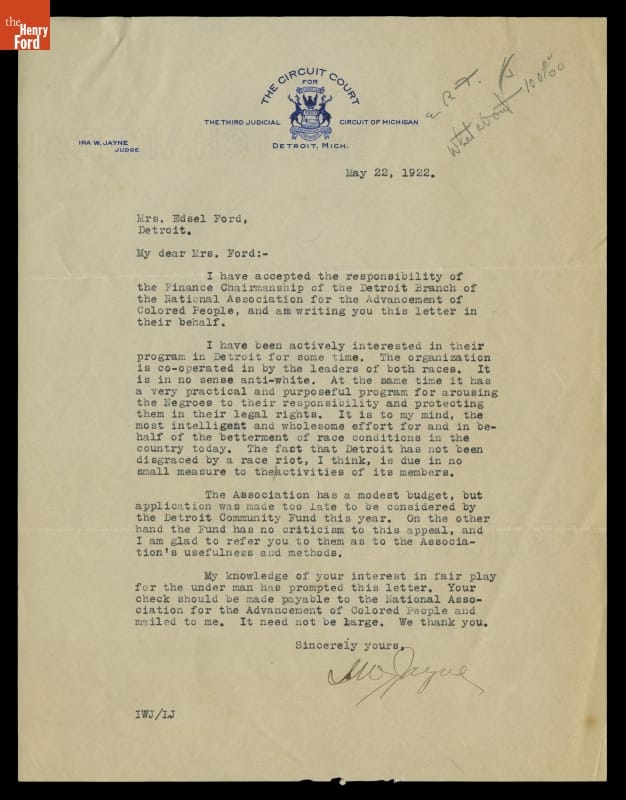 Letter from Judge Ira W. Jayne to Eleanor Clay Ford regarding the Detroit Chapter of NAACP, May 22, 1922