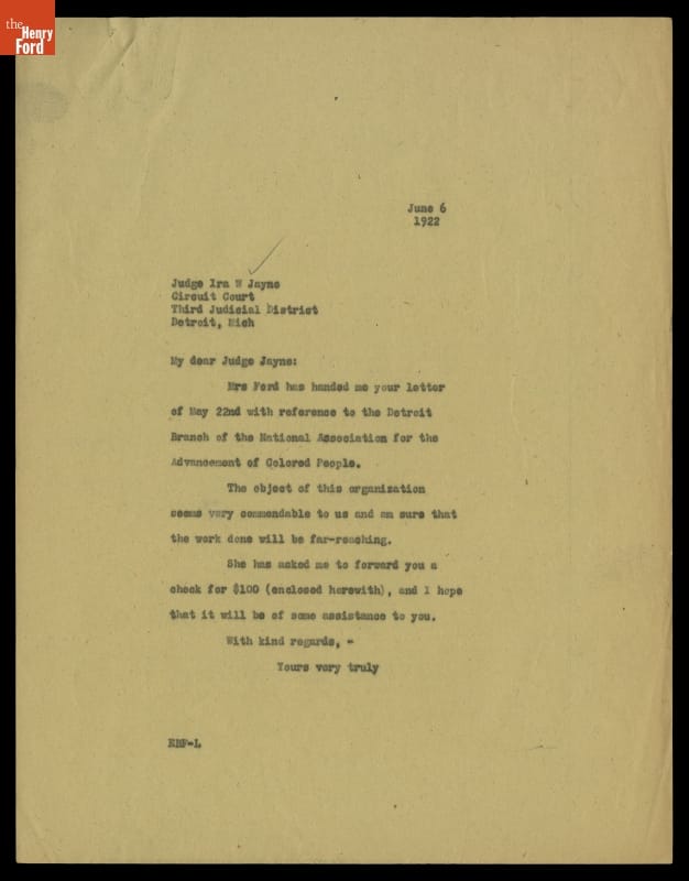 Letter from Edsel Ford to Judge Ira W. Jayne regarding the Detroit Chapter of NAACP, June 6, 1922